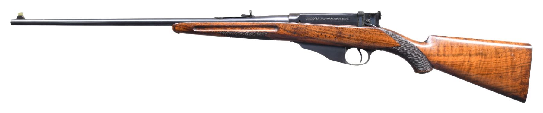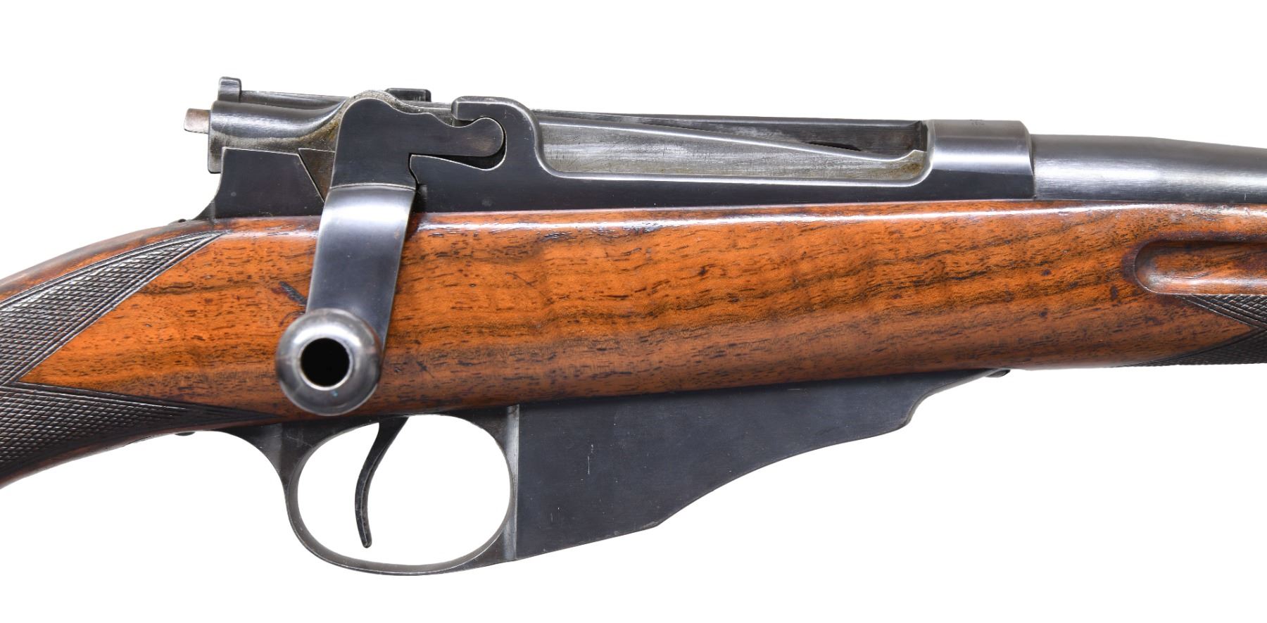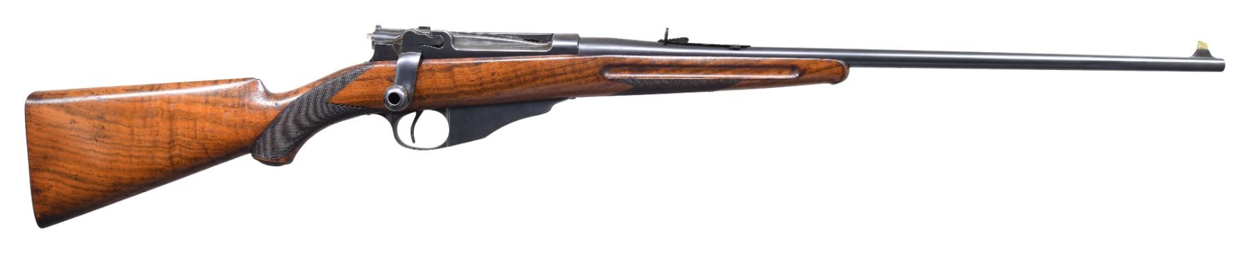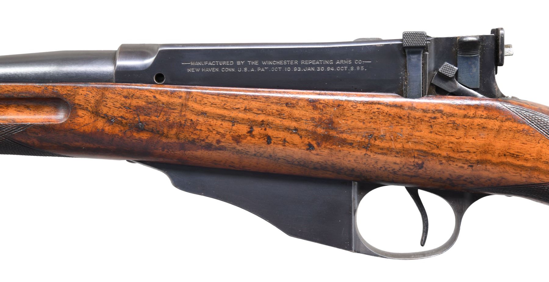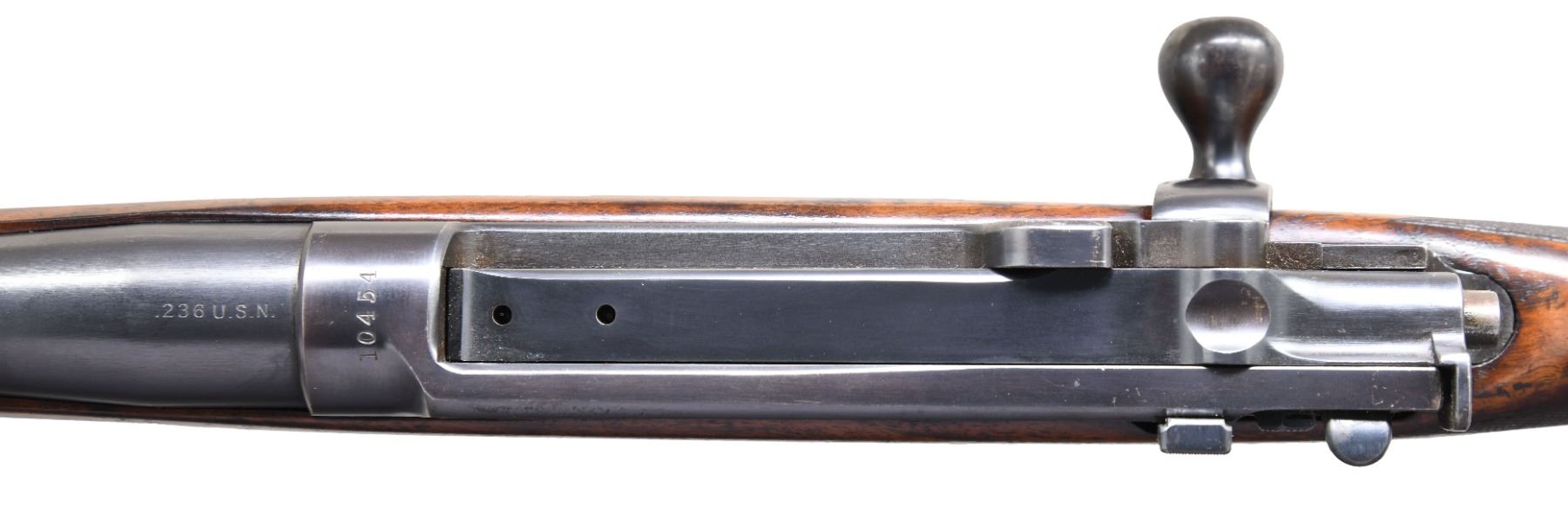 PULL SPORTING RIFLE WITH LETTER. Cal. 236 USN. S# 10454. Bbl. 24" round with German silver blade front sight & elevator adjustable semi buckhorn rear. One of approximately 1,700 Winchester-Lee sporting rifles mfg. by Winchester around the turn of the Century. Nicely figured checkered pistol grip walnut stock with schnabel tipped forend, Hard rubber Winchester grip cap and replacement steel widow's peak buttplate. Top of bbl., ahead of breech marked "236 USN". UNATTACHED ACCESSORIES: 2 stripper clips. Waddy Colvert Firearms research letter stating the following: "Serial number 10454 / Rifle / Checkered stock with pistol grip / Oil Finish / Shotgun butt rubber / Received in warehouse January 4, 1898 / Shipped from warehouse January 5, 1898. CONDITION: metal parts retain 95% original blue a few scattered areas of fine, peppery oxidation. Stock shows numerous light scratches and handling marks. Very good bore retains strong rifling and mild frosting in grooves. (01-26767/BH). ANTIQUE. $2,000-3,000.