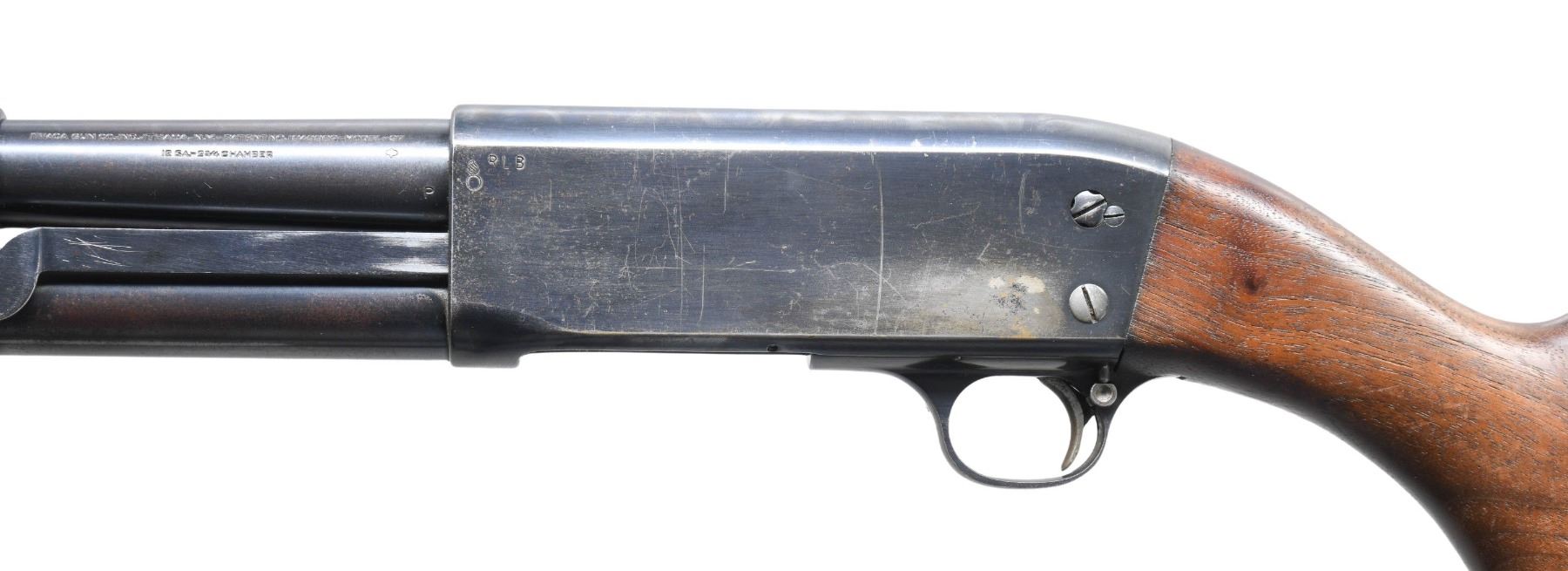 SHOTGUN WITH COPY OF SHIPPING RECORD TO THE AUGUSTA ORDNANCE DEPOT. Cal. 12 Ga. S# 61305. Bbl. 20" cyl. According to Bruce Canfield in "COMBAT SHOTGUNS" on pages 132 & 133, only 1,422 of these trench guns were mfg in the serial number range 57,820-61,450, making these the rarest and most desirable WWII trench guns in existence. Metal parts finished in high polish commercial quality blue. Top left side of receiver marked "RLB" with flaming bomb. Left side of bbl. at breech end has "P" proof. Smooth walnut pistol grip stock & grooved slide handle; head of stock marked with matching S#. Black plastic buttplate marked "ITHACA GUN CO INC". Rear swivel inletted into bottom of stock, front swivel attached to bayonet lug. 6 row sheet metal handguard / bayonet lug assembly is a correct style replacement, lacking hole at rear of lug. UNATTACHED ACCESSORIES: copy of Ithaca Gun Co. shipping record order # 2061 as being sold to the Rochester Ordnance District and shipped to the Commanding Officer of the Augusta Ordnance Depot on July 3, 1942 with this gun listed by S#. CONDITION. bbl. & receiver retain 75% original high polish blue with high point wear, scratches & scattered areas or peppery surface oxidation, one 1" area of thinning / missing finish on left lower side of receiver at rear. Replacement heat shield retains 97% blued finish. screws do not recess flush with metal. Stock set shows scattered light to moderate handling marks, scratches & impressions. There is a 6" thin scratch running from right side nose of comb rearward. Right side of toe has area of removed finish with unknown SSN lightly scratched in. Right side of stock has 1-7/8" crack extending rearward from receiver. Left side has similar 7/8" crack. Bright, shiny bore. Mechanically excellent. (25-1663/BH). CURIO. $8,000-12,000