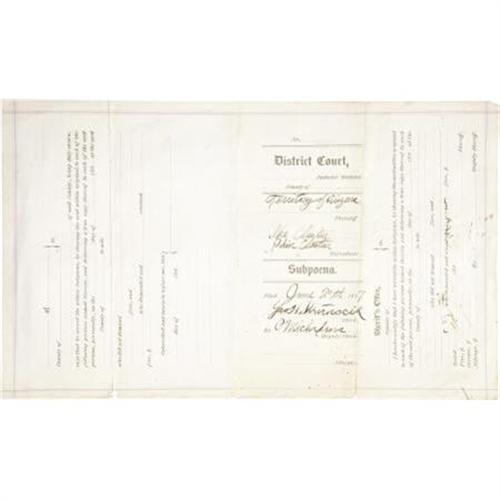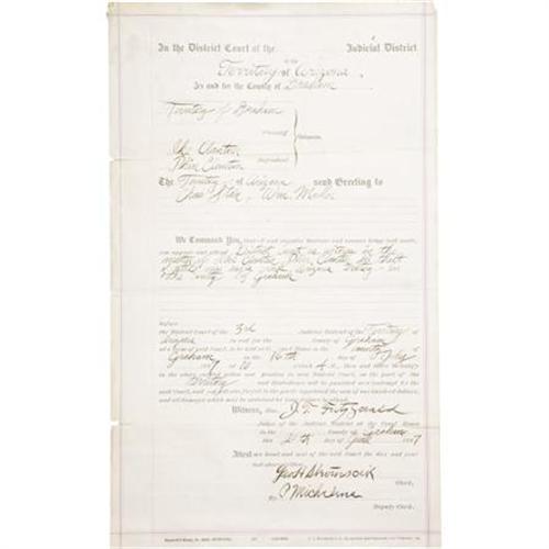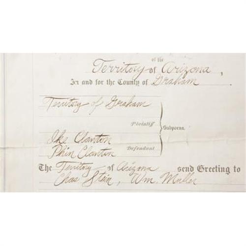 <B>RARE DOCUMENTS AFTER "OK CORRAL" REGARDING CLANTON'S STEALING CATTLE - TOMBSTONE, ARIZONA TERRITORY “IKE & PHIN CLANTON” 1887</B></I> - Tombstone Arizona Territory, Cochise County. Ike Clanton was unarmed when the Earp's and Doc Holliday advanced on them at the O.K. Corral. Ike fled at the first sound of gunfire with Billy Claibourne hot on his heels. His brother William “Billy” Clanton was killed in the shootout along with Frank and Tom McLowery. Ike Clanton schemed revenge on the Earp's. In March 1882 Clanton and 4 henchmen, shot and killed Morgan Earp. Wyatt Earp then gathered a posse and went after the Clanton Gang killing three of them. Ike fled to Mexico and hid under an assumed name. When Earp finally gave up the search, Ike returned to the Tombstone area, took up his old rustling ways, and was shot in 1887 by lawmen. <BR><BR>Phineas Fay Phin Clanton (1843-1905) The Clantons and their ranch hands and associates were known as the (Cow Boys), and they had a reputation for reckless behavior. They were accused of cattle rustling from across the U.S.-Mexico border as well as other acts of banditry and murder <BR><BR>This document, Dated June 20. 1887. Territory of Arizona, vs. Ike Clanton & Phin Clanton is a subpoena for Chas. Stein & Wm. Mullers in the District court as witness in the matter of Ike & Phin Clanton for theft of Cattle near Eagle Creek, Arizona Territory in the County of Graham. Signed Judge J. T. Fitzgerald. June 20, 1887. (Ike had been killed June 1, 1887 at Eagle Creek by Deputy Sheriff J. V. Brighton & Deputy George Powell). 8.5”x 14”. Very fine condition, some small chips in folds.<BR><BR><b>Shipping:</b> Flat Material, Small (<a target="_blank" href="http://www.heritageauctions.com/common/shipping.php">view shipping information</a>)
