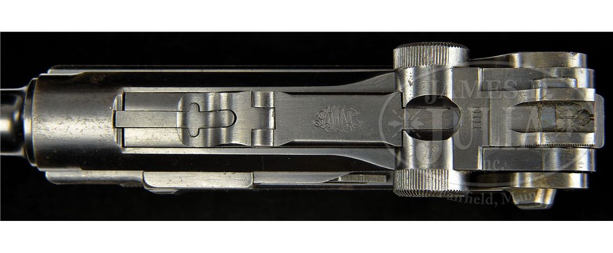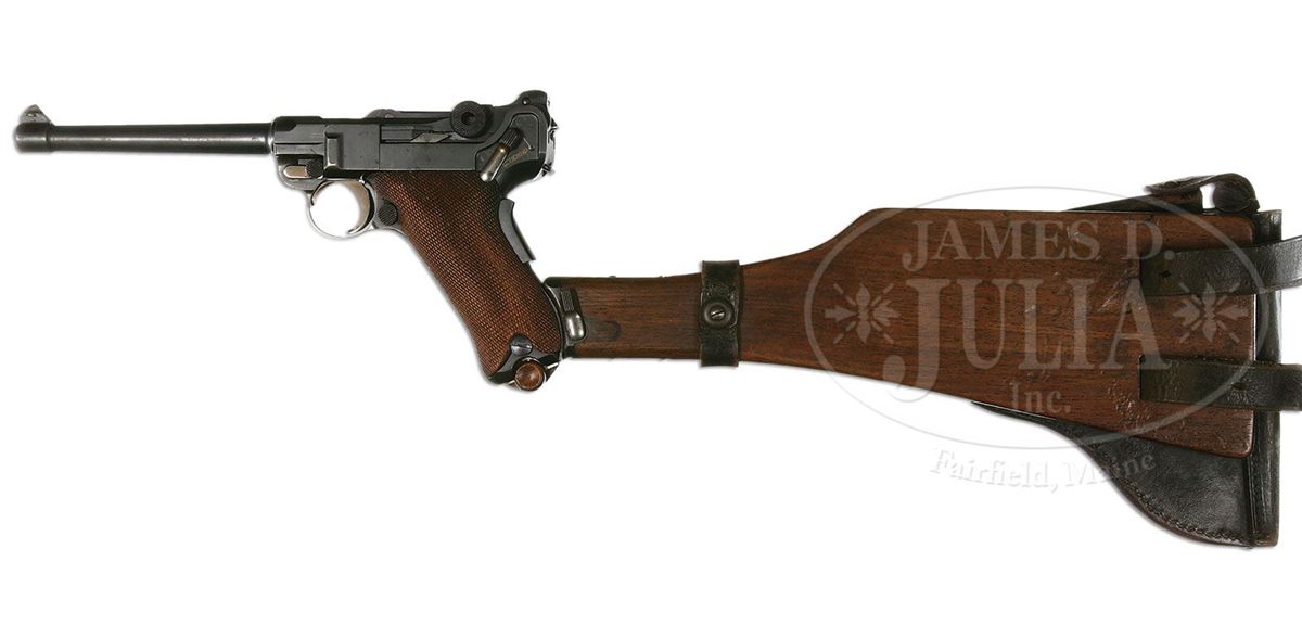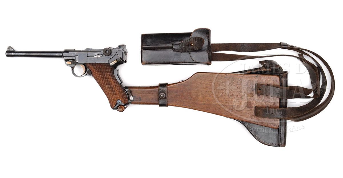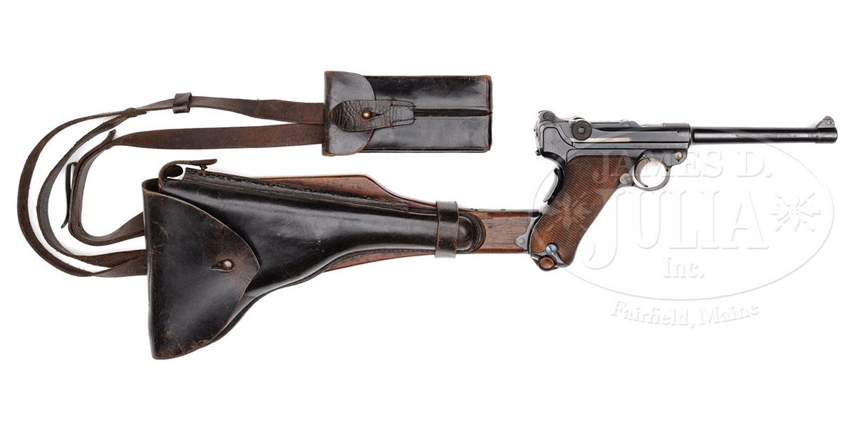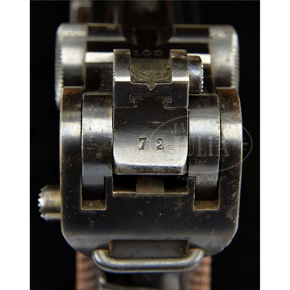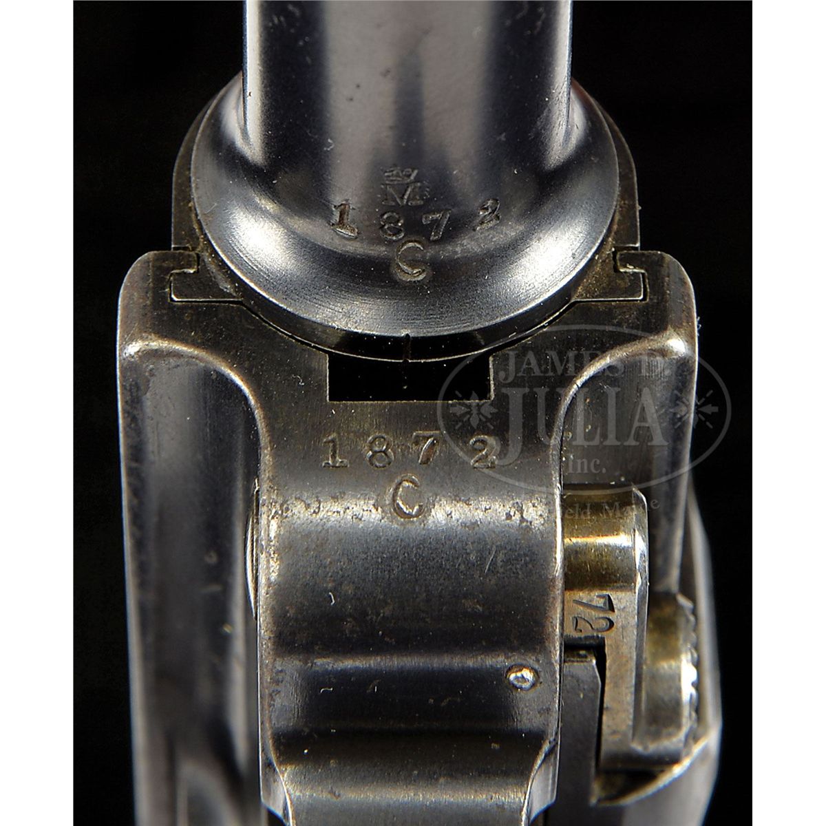 SN 1872C. 6" 9mm Crown/M proofed bbl. "DWM" scroll on center toggle link. 100m/200m adjustable Navy rear sight. No commercial or Navy proofs on left receiver. “C” suffix added to serial number, which is from the first German Navy contract production serial range. Grip safety. All numbered parts on the gun are matching down to the checkered walnut grips. "Cal. 9mm" marked magazine. Gun accompanied by a stock and holster rig with straps. Holster is black leather with no visible markings and has an unnumbered takedown tool. Stock is Navy configuration without the metal disk seen on German military versions, and has a lug that is not numbered. Black leather straps have an unmarked black leather double magazine pouch attached. This gun is featured on p. 306 of Dr. Geoffrey Sturgess' The Borchardt & Luger Automatic Pistols. A rare Navy Luger variation. PROVENANCE: Collection of Dr. Geoffrey Sturgess. CONDITION: Excellent retaining about 95% orig blue with some scattered light corrosion. Retains 80% orig straw. Bore is lightly pitted. Grips are moderately worn. Magazine is very good with one of the knobs on the wood bottom well worn. Mechanics are excellent. Holster is very good with some surface flaking, primarily on the cleaning rod pouch, which is also missing an ear on the pouch closure. Straps are well worn and the magazine pouch is excellent. Stock is excellent with a few minor chips and dings in the wood and a larger chip on the right side top directly in front of the holster. 4-52064 BWS86
