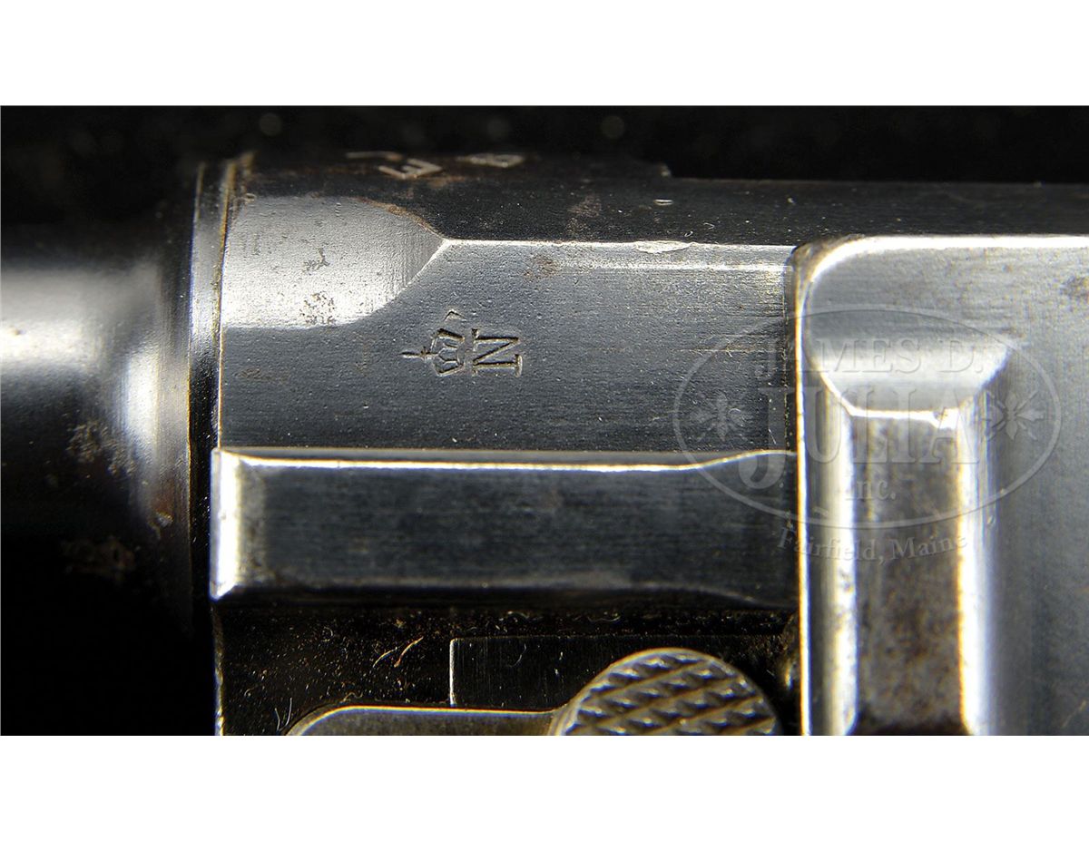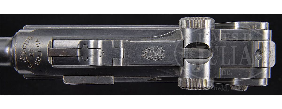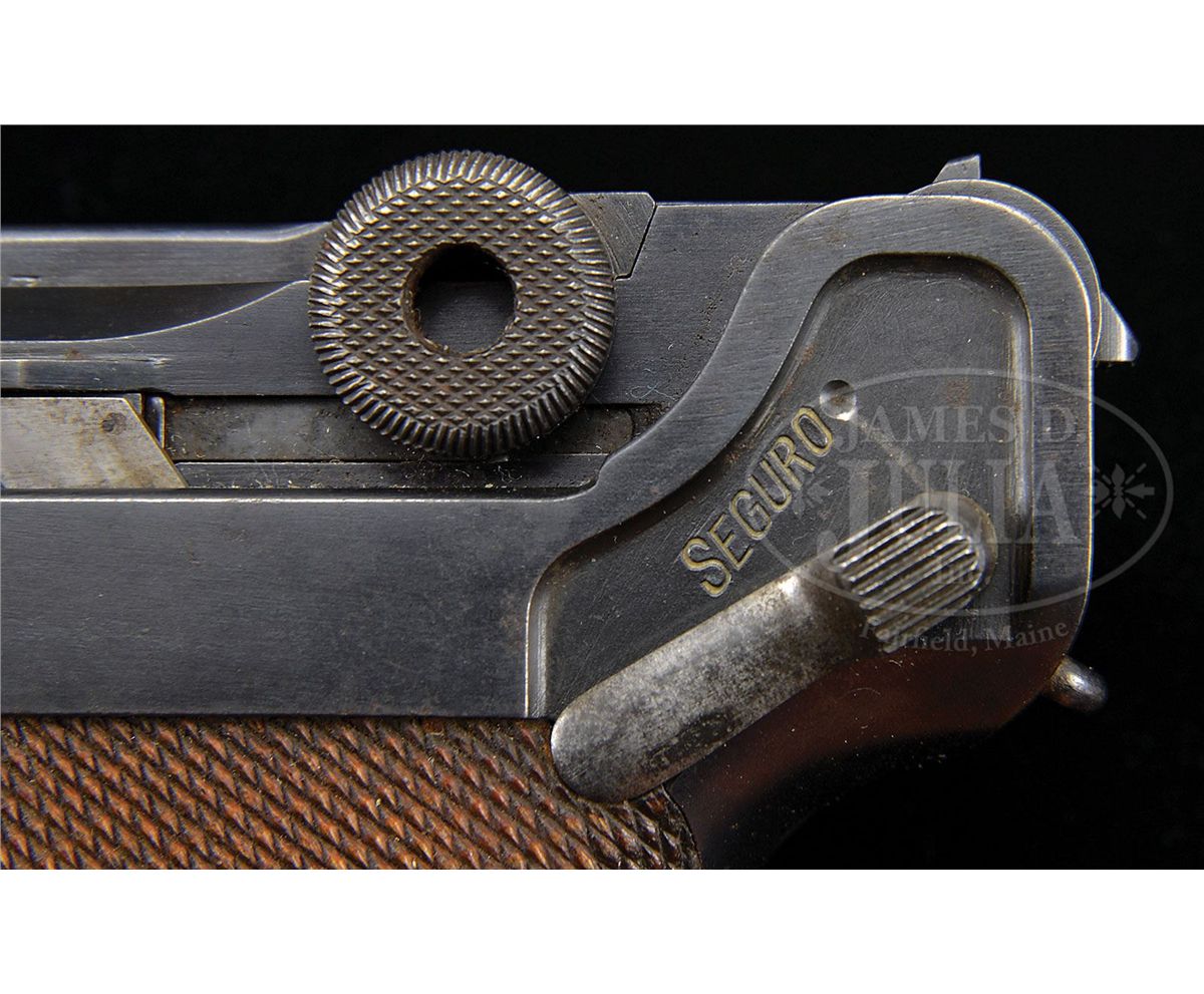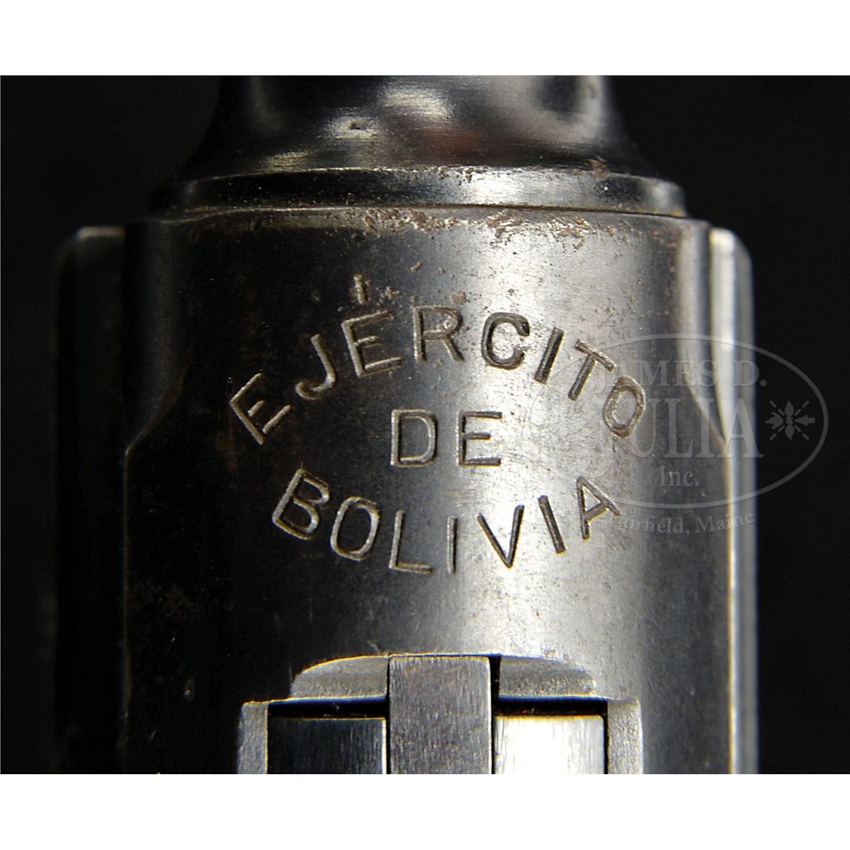 SN 64512. 4" 9mm bbl. "EJERCITO/DE/BOLIVIA" marked in an oval shape above chamber. "DWM" scroll on center toggle link. "SEGURO" marked safety. "CARGADO" marked extractor. Crown/N proofs. No holdopen fitted in manufacture. Checkered walnut grips. Plain wood bottom magazine. All numbered parts are matching. This gun is featured on p. 699 of Dr. Geoffrey Sturgess' The Borchardt & Luger Automatic Pistols. This was one of about 200 pistols purchased for Bolivian Army issue. PROVENANCE: Collection of Dr. Geoffrey Sturgess. CONDITION: Very fine retaining 90% original blue and 60% original straw with scattered light corrosion and gripstraps that are starting to brown. Bore is worn with light pitting. Grips are moderately worn with some minor chips and indentations. Magazine is excellent with a few dings on the wood bottom. Mechanics are sound. 4-52859 BWS79