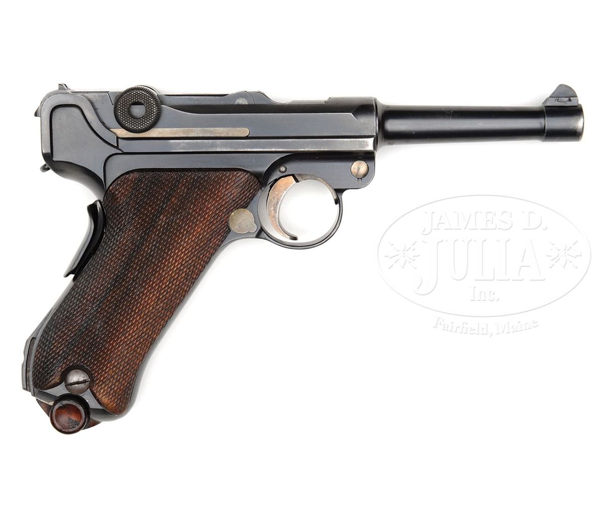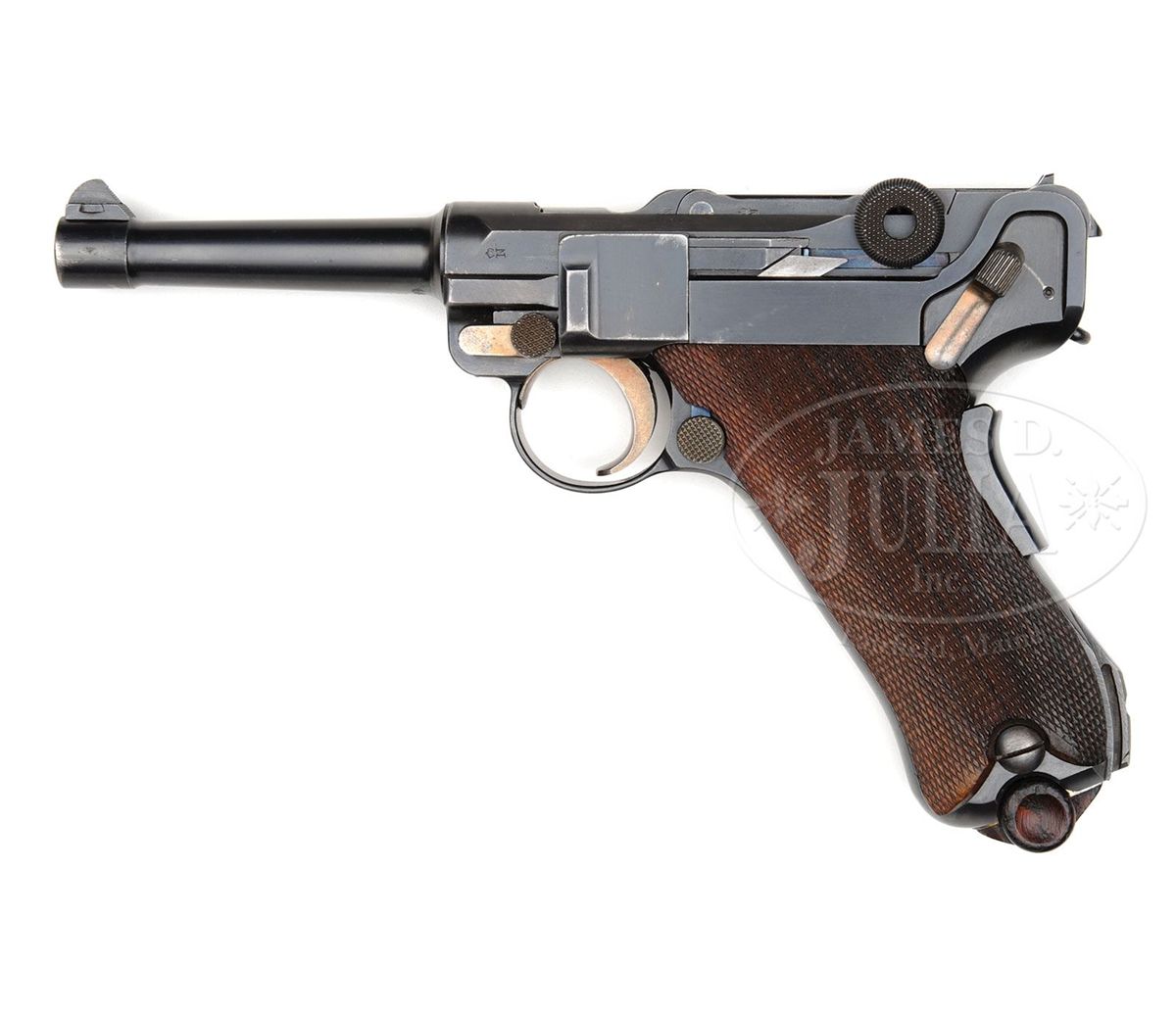 SN 71289. 4" 9mm bbl. "DWM" scroll on center toggle link. Horizontal Crown/N proof mark on left receiver. Grip safety, upper GESICHERT mark in frame recess, stock lug. Checkered walnut grips. All numbered parts are matching. Proper plain wood bottom magazine. This gun is featured on p. 895, 1090 and 1113 of Dr. Geoffrey Sturgess' The Borchardt & Luger Automatic Pistols. This is one of the rarer commercial Luger variations. PROVENANCE: Collection of Dr. Geoffrey Sturgess. CONDITION: Excellent. Retains 97% orig blue and 95% orig straw. Bore is dark and lightly pitted. Grips are lightly worn with nice color and wood grain. Magazine is excellent with minor dings on the wood bottom. Minor scratches on the right side of the bbl and a scratch above the chamber. 4-52780 BWS68