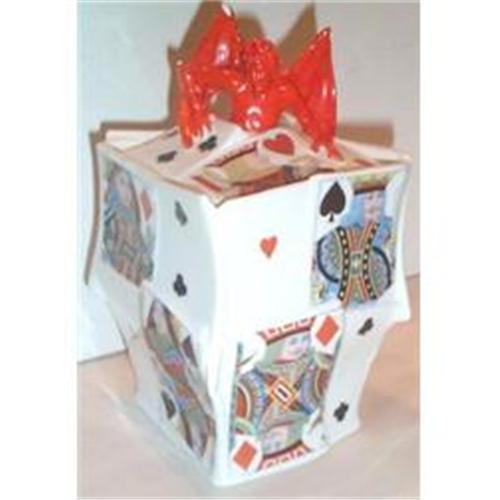This fantastic and extremely RARE Royal Bayreuth Porcelain Devil and Cards Covered Humidor is in Excellent condition with no cracks, dings or hairlines but does have two small chipos on the devils wing on the top of the humidor. This measures 4.50" square and stands 8" tall. It is marked on the bottom with the familiar blue Royal Bayreuth Logo.