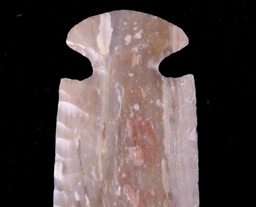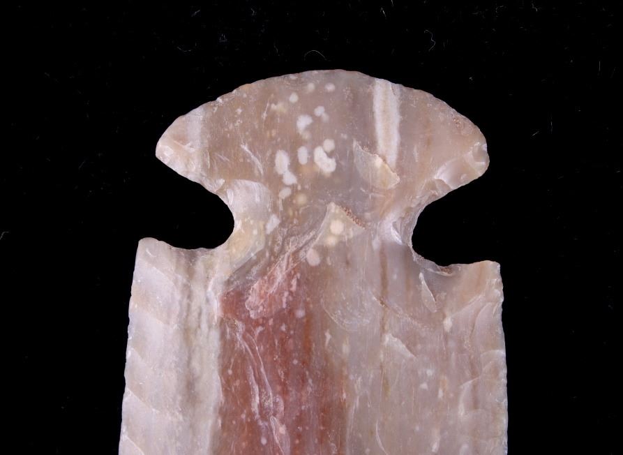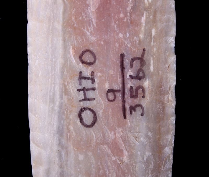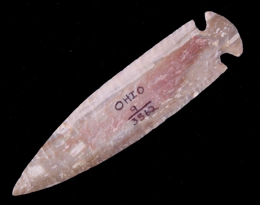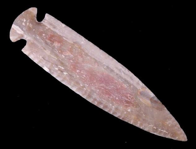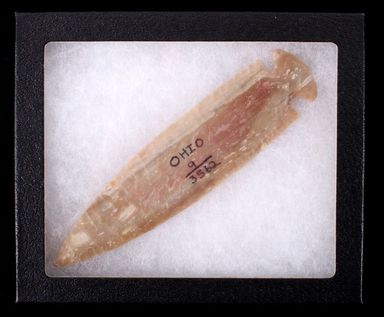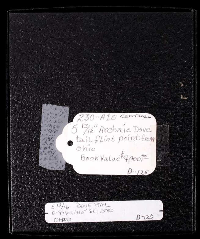 This is an extraordinary authentic pre-historic notched Dovetail / St. Charles long spear point with a nice high grade of G9+ and book value of $4,000. The ancient point is expertly constructed from a fine Flint Ridge material with outstanding color and is in very well-preserved excellent museum quality condition. The point shows a large / tall Archaic Dovetail / St. Charles spear point with heavy notching. The spear point has a collection museum tag that reads, “230-A10 Carrizozo 5 13/18” Archaic Dove Tail Flint Point from Ohio Book Value $4000.00 D-125” and “5 13/16 Dove Tail G-9+ Value $4,000 Ohio D-125”. This is truly a rare authentic St. Charles / Dovetail spear point with outstanding condition and color ranging from red/pink and green to browns and tans and was collected in Ohio. This 9000-6000 BC artifact is from the Ohio Native American Indians and is in exceptionally fine spear point showing wonderful detail and an extraordinary size. Provenance: From a multi-generation artifact collection spanning 80-100 years from Las Cruzes, New Mexico. The point is in excellent condition and measures 5 7/8”L x 1.5”W. Riker case is 5.5”x6.5” and 1” thick. The point is hand painted on the front with a museum collection number of OHIO 9/3562.