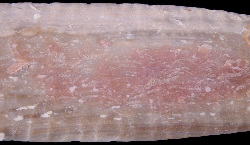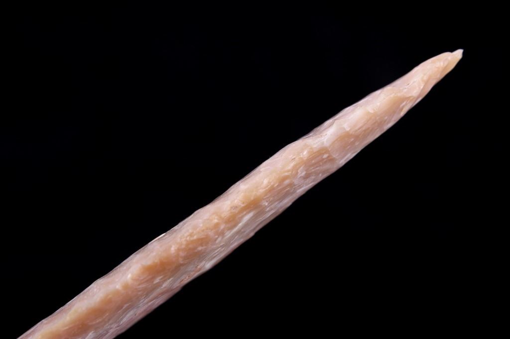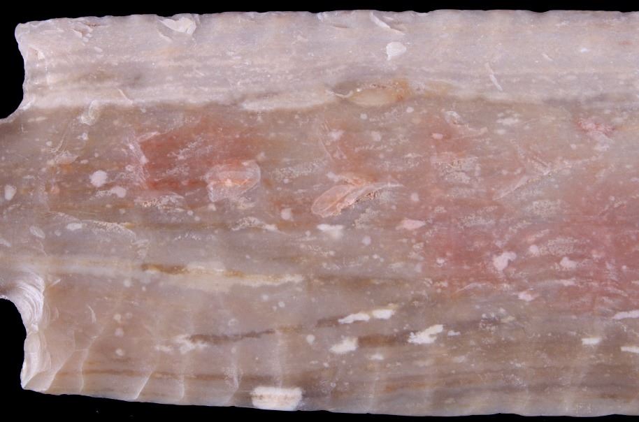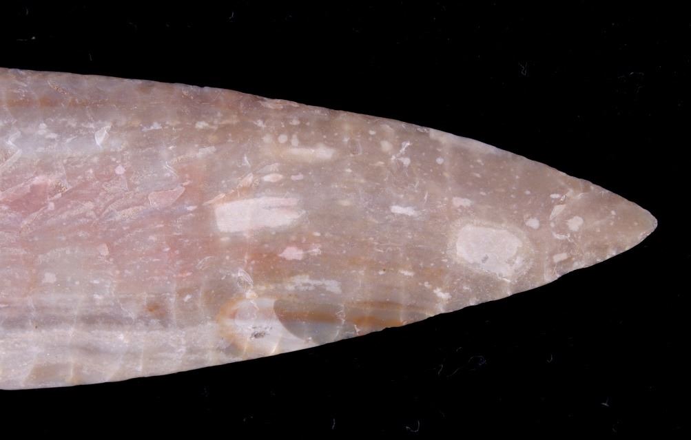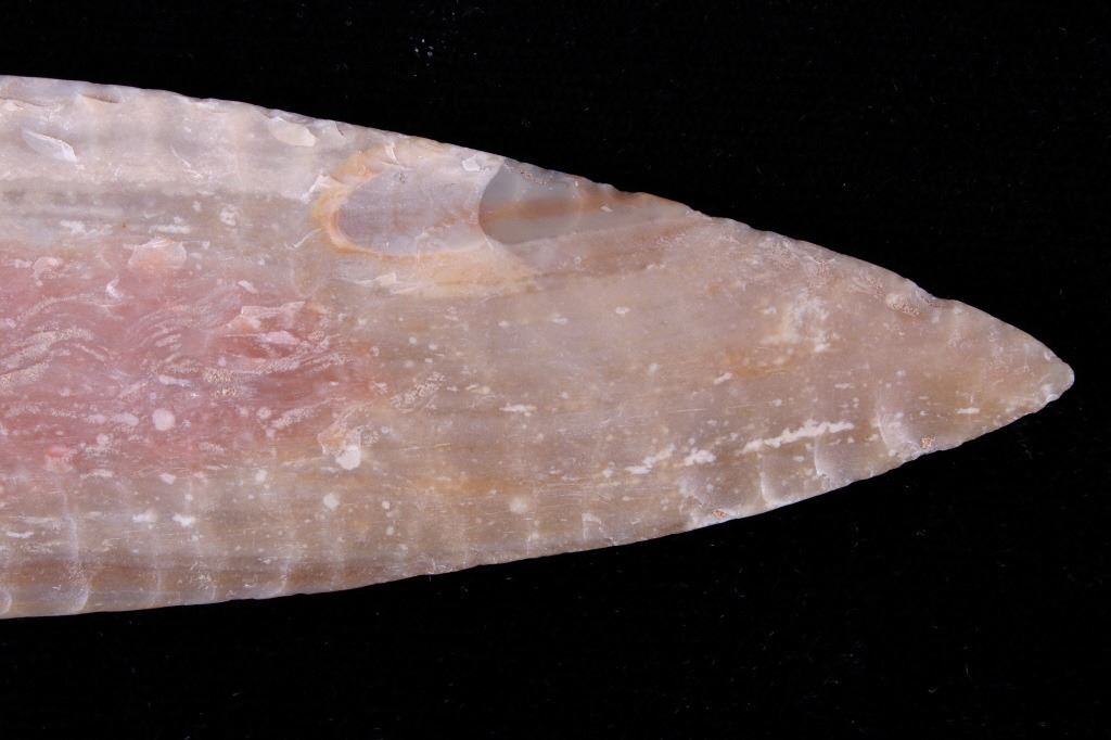 This is an extraordinary authentic pre-historic notched Dovetail / St. Charles long spear point with a nice high grade of G9+ and book value of $4,000. The ancient point is expertly constructed from a fine Flint Ridge material with outstanding color and is in very well-preserved excellent museum quality condition. The point shows a large / tall Archaic Dovetail / St. Charles spear point with heavy notching. The spear point has a collection museum tag that reads, “230-A10 Carrizozo 5 13/18” Archaic Dove Tail Flint Point from Ohio Book Value $4000.00 D-125” and “5 13/16 Dove Tail G-9+ Value $4,000 Ohio D-125”. This is truly a rare authentic St. Charles / Dovetail spear point with outstanding condition and color ranging from red/pink and green to browns and tans and was collected in Ohio. This 9000-6000 BC artifact is from the Ohio Native American Indians and is in exceptionally fine spear point showing wonderful detail and an extraordinary size. Provenance: From a multi-generation artifact collection spanning 80-100 years from Las Cruzes, New Mexico. The point is in excellent condition and measures 5 7/8”L x 1.5”W. Riker case is 5.5”x6.5” and 1” thick. The point is hand painted on the front with a museum collection number of OHIO 9/3562.