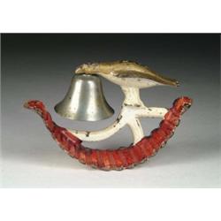 RARE EAGLE ON PERCH ROCKER BELL TOY. Of unknown manufacture, this is a rare and seldom seen bell toy. The gold and cream colored eagle with a bell attached under beak is standing on a cream colored perch this is affixed to a scalloped rocking base. This toy is a one piece iron casting of fine quality painted in cream with gold and red highlighting. Brass bell is similar to those used by The Gong Bell Co. and N. N. Hill Brass Co. SIZE: 5”. CONDITION: Very fine original condition. JL 1-4096 (500-700)