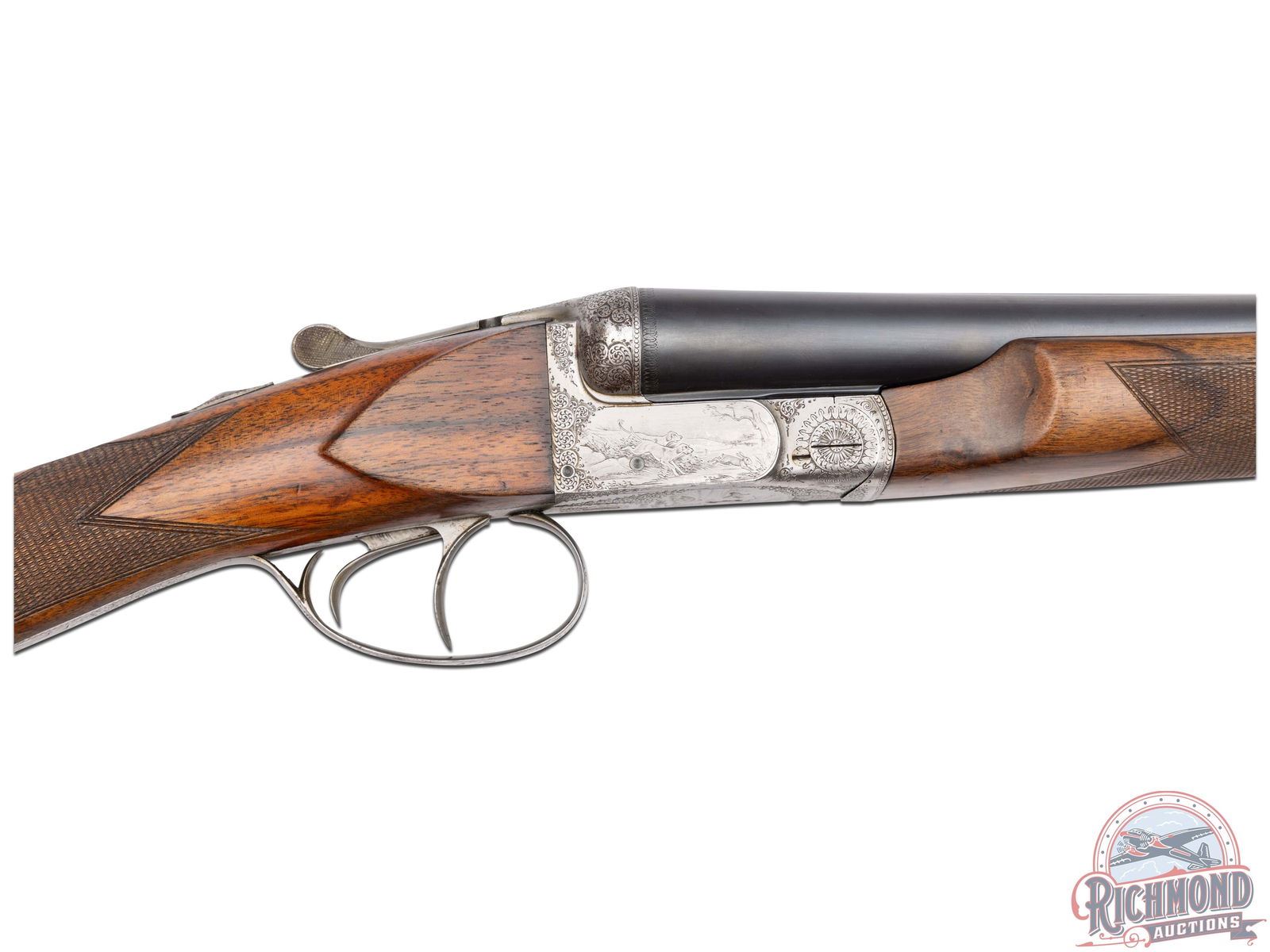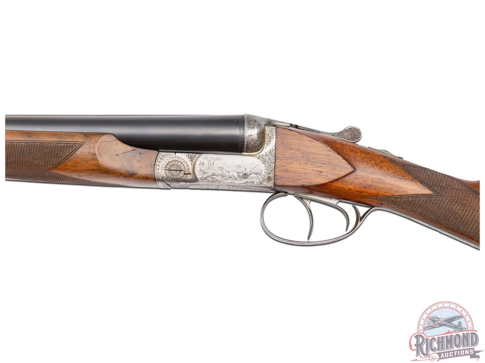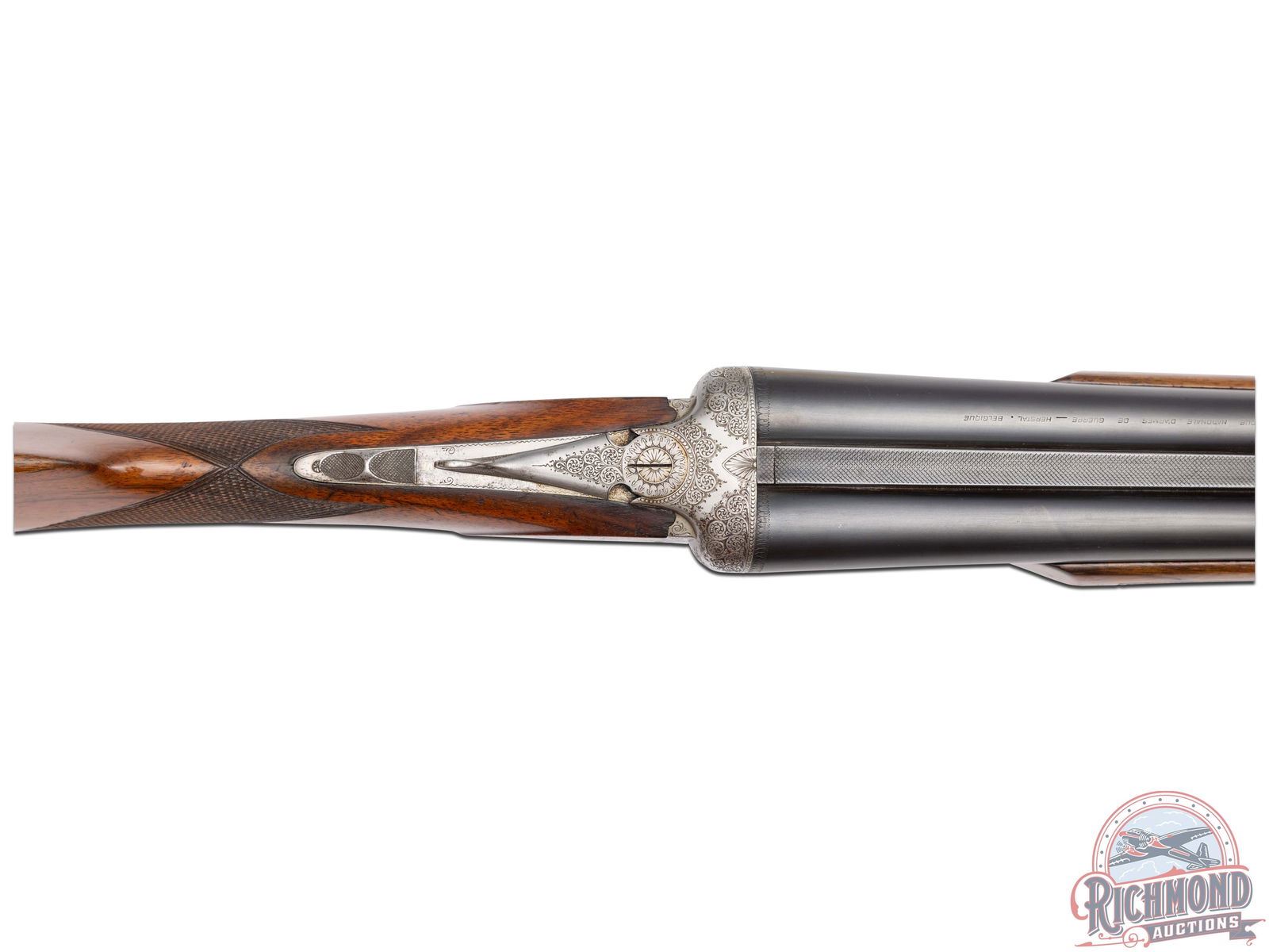 Four digit serial number, manufactured in the early 1900's by Fabrique Nationale in Belgium. Known as the Anson Fusil boxlock. These were typically custom ordered during the production of the Auto 5, and rarely imported into the US! Matching serial number on the water table and bottom of both barrels. Features two 12 gauge blued barrel sets, both with solid rib. One choked Full/Improved and the other barrel choked Improved cylinder. Both barrels are stamped on top "FABRIQUE NATIONALE D'ARMES DE GUERRE - HERSTAL BELGIQUE" with a nickel bead front sight. Liege and Nitro Proof marks on the bottom of both barrels. Coin finished receiver features original custom scroll and floral engraving on the screws, fences, bottom tang and release lever. Later custom engraving done by master engraver Rene DeWil. Features dog and quail scene on the left panel, dog and rabbit scene on the right panel, ducks in flight on the trigger guard and quails in a woodland scene on the bottom. Left panel is signed "R.DEWIL". Double triggers and tang mounted safety. Walnut straight grip stock and beavertail forearm, both hand-checkered. Fitted with a red ventilated recoil pad. Set comes in a leather take-down case with green felt lining. LOP: 15". DAC: 1". DAH: 1-1/4". CALIBER: 12 GA. S/N: 2286. FFL STATUS: Curio & Relic.