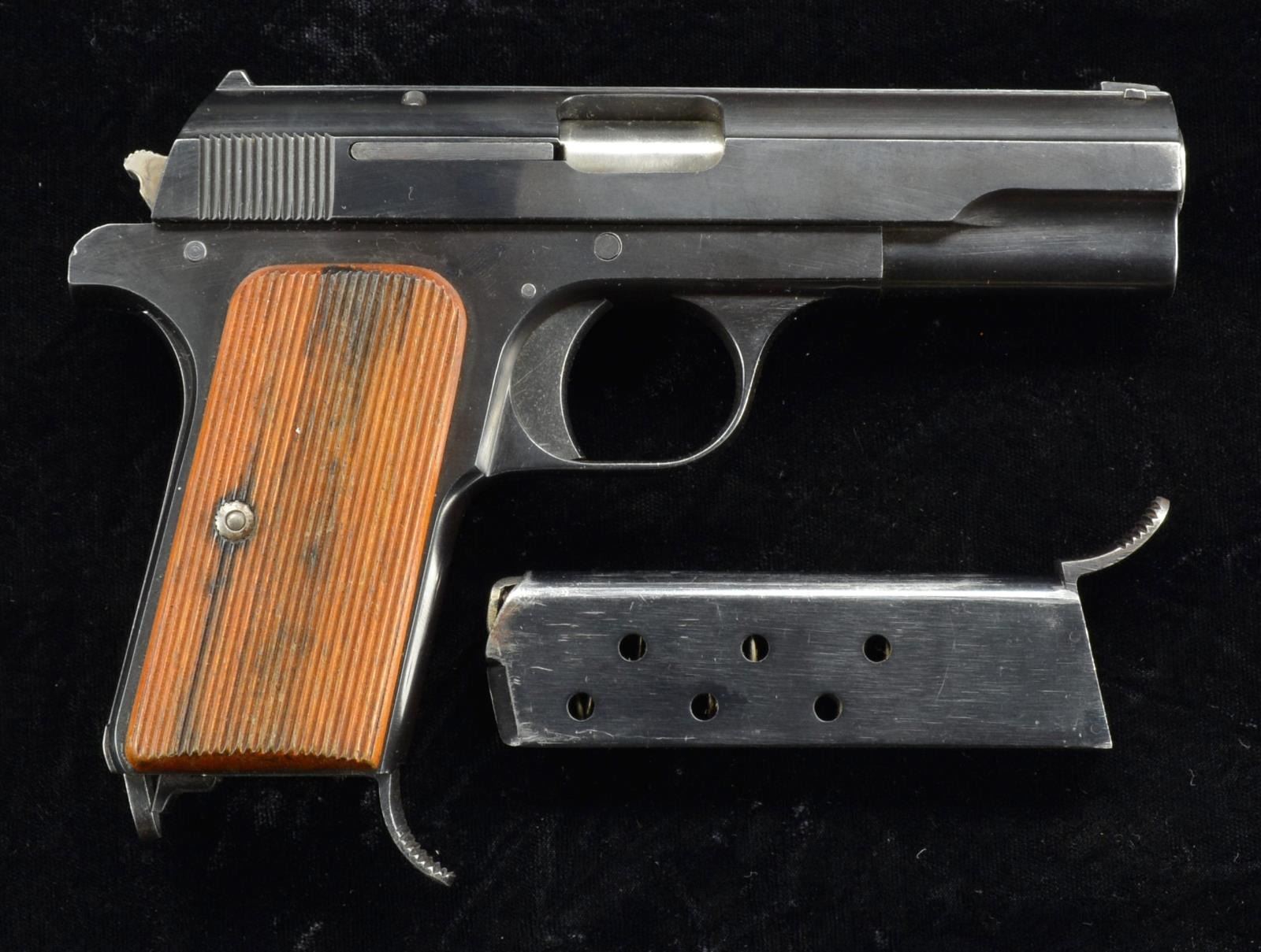 PISTOL. Cal. 380 ACP. S# C-392 (1937). S# range C-1 to C-1318 were designated as early Model 37 pistols mfg. in 1937; polish blue finished w/out thumb safety near hammer & in 9mm short cartridge. Bbl. 3.93". Fixed sights. Frame has lanyard loop at butt & grip safety. Vertically grooved 2 piece hardwood grips. MAGS: 2 -7 rd. w/ finger extension. CONDITION: very good overall appearance w/ edge wear, pinprick oxidation & marks. Very good bore. (22-768/MD). $200-400.