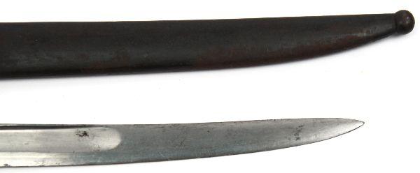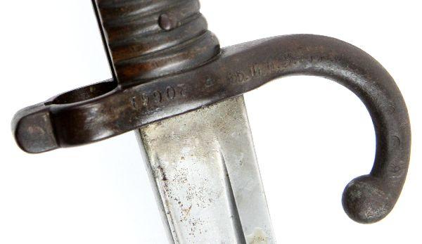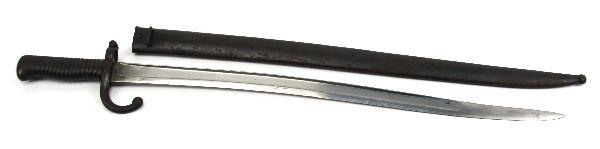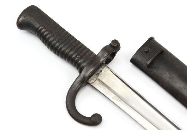 Early French chassepot bayonet and scabbard with 22 inch fullered blade. Very good condition with minor discoloration and wear from use.