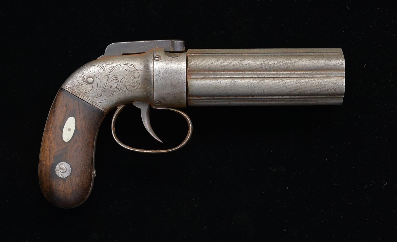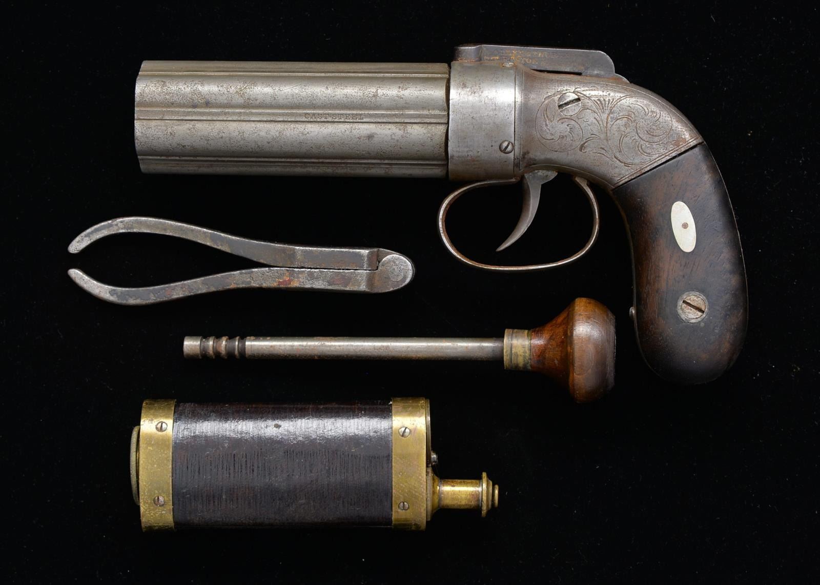 PISTOL COMPLETE WITH ACCESSORIES. Cal. .31. S# 14. 3.5” 6 Bbl. cluster, “CAST STEEL” stamped on early thin bbl. rib, “ALLEN & THURBER / GRAFTON MASS” stamped on left side of bar hammer, engraved frame & plain screwed on nipple shield, early slim grips, production 1837-1839. CONDITION: good-very good overall, complete & matching, gray patina, mechanically fine, smooth bores. Accompanying 3 compartment Allen patent flask is very good as his wood handled rammer, 2 cavity scissor mold is good w/ pitting. PROVENANCE: Lifelong collection of early Allen pistols. (01-18563/JS). ANTIQUE. $800-1,200.