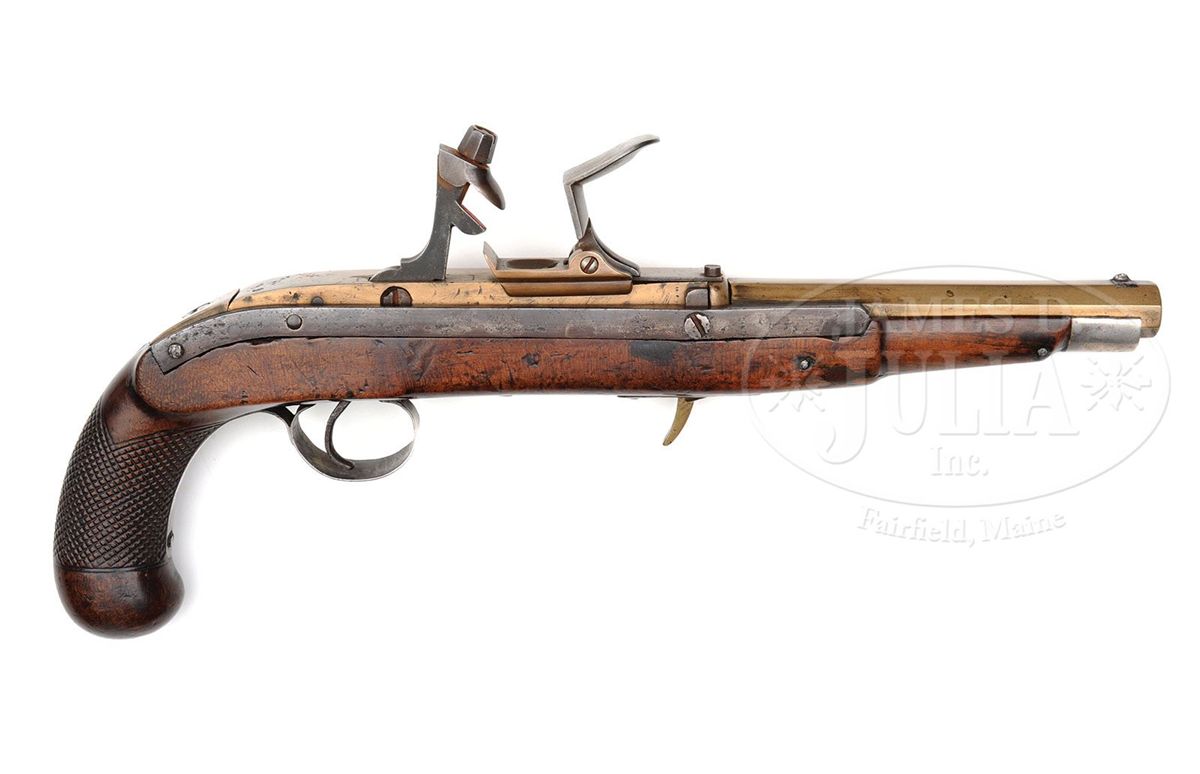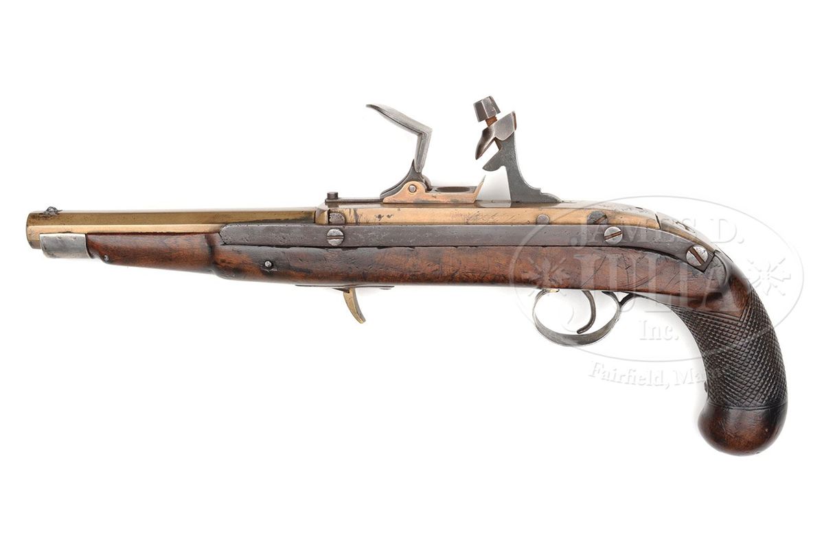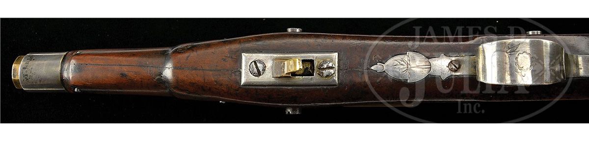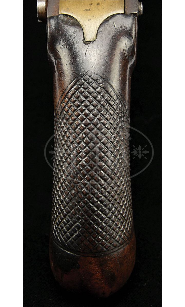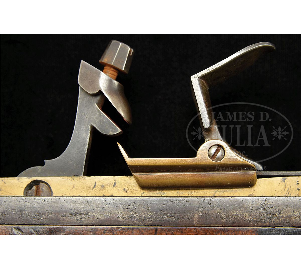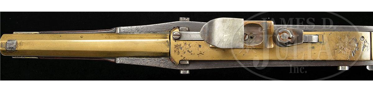 PLEASE NOTE (10-11-13): This gun is an excellent reconversion to flint. Around 1970 it was sold by Jack Malloy who acquired it from John Williams, who originally acquired it from Jackson Arms in 1963. This exact gun is illustrated on page 45 on “Maine Made Guns & Their Makers” by Dwight DeMerritt, Jr. The illustrations show the gun as percussion and also as flint. SN 36. Cal .49 at muzzle -.50 at breech. 5 ½ “ oct bronze bbl is smoothbore and has iron front sight set back 9/16” from muzzle. Bbl is mounted to a pair of 9” long iron supporters and aligned to receiver with a 1- 1/2 “ long bronze tang piece held by a horizontal screw and a vertical screw. 6-1/2” long receiver marked only “36” on right side of receiver pivots on a single screw 1-1/2” in front of back supporter screw and aligned by a pair of iron chocks and held down with an iron spur latch. Bore of receiver is .52 Cal and measures 2-1/2” deep to an iron plug inserted during manufacture. Cock and frizzen are iron and made in the style of Hall’s Patent Drawing (1811) indicating earliest of manufacture. Receiver is elevated by moving the iron spur latch which has pressure from an internal leaf spring allowing the breech to automatically elevate for loading (a feature eliminated on later mass production guns). Catch plate is iron with an integral shoe that engages spur latch in ready to fire position. Furniture consist of 7/8” German silver nose band and trigger guard having a worn engraved finial and floral motif on bow. Maple stock measures 14” long with 2-1/2” area of pistol drip that is nicely checkered with a double border incised carving bordering top and bottom ends of checkered area. Note: Hall pistol with number 35 stamped on the right side of the receiver in the Smithsonian collection possibly making these either a pair or consecutively made pistols. PROVENANCE: Frank Sujansky Collection CONDITION: Generally very good. The iron supporters are dark patina,lightly pitted overall with medium pitting at breech joint indicating it has been fired. Likewise the Bronze receiver and Bbl indicate it’s been fired with numerous light dents on top from tapping to loosen up a stuck breech, quite common with Hall’s. The bore is very dirty indicating no one has cleaned this piece. All springs and screws appear to be original with light to medium pitting and only the top jaw is a replacement. The German silver furniture shows wear and use but all intact with 75% of the engraving visible on the trigger guard. The Maple stock is in overall very good condition having the normal age related nicks and scratches. There is an old repaired crack extending from the nose band through to the finial of the trigger guard that is sound. 4-49492 PAS99
