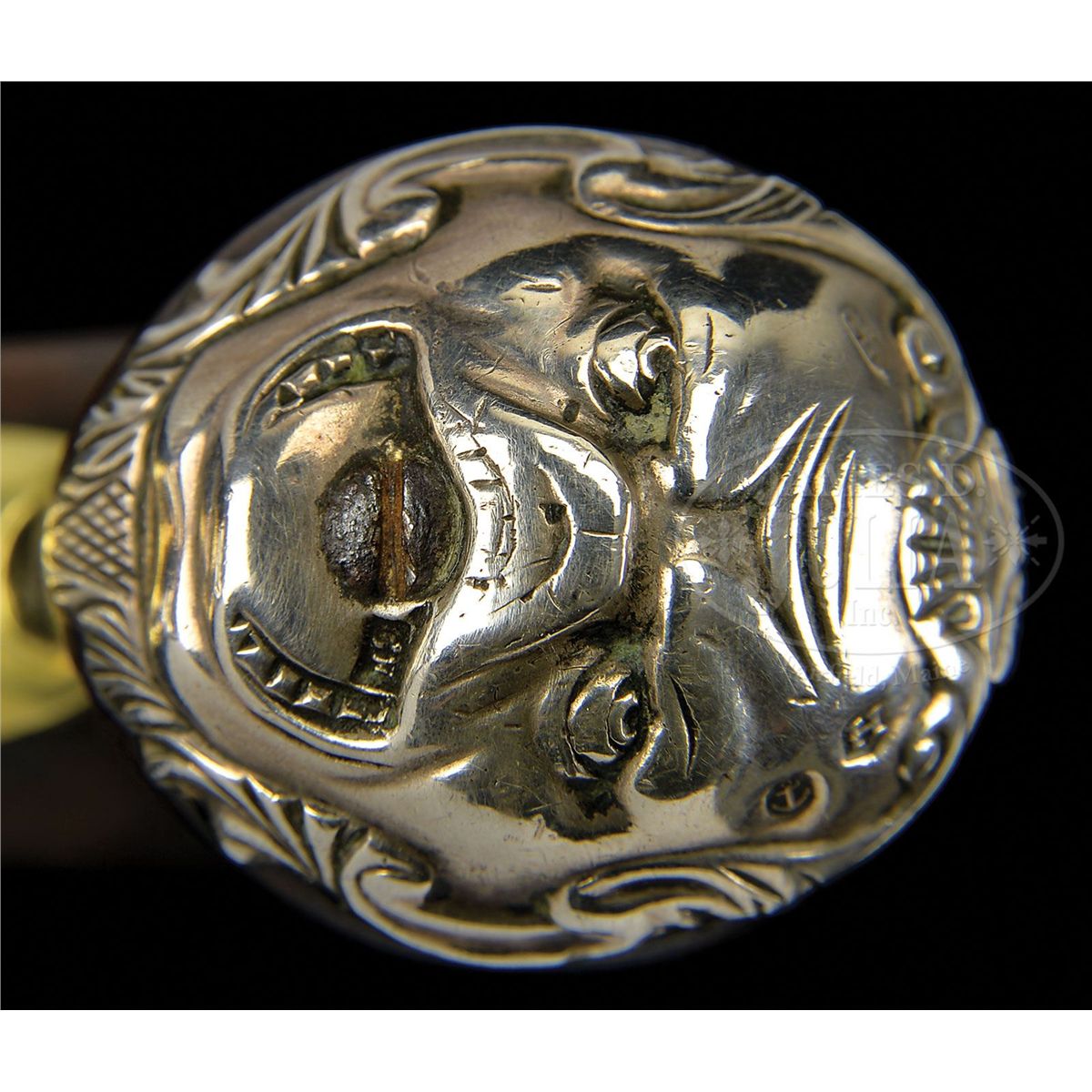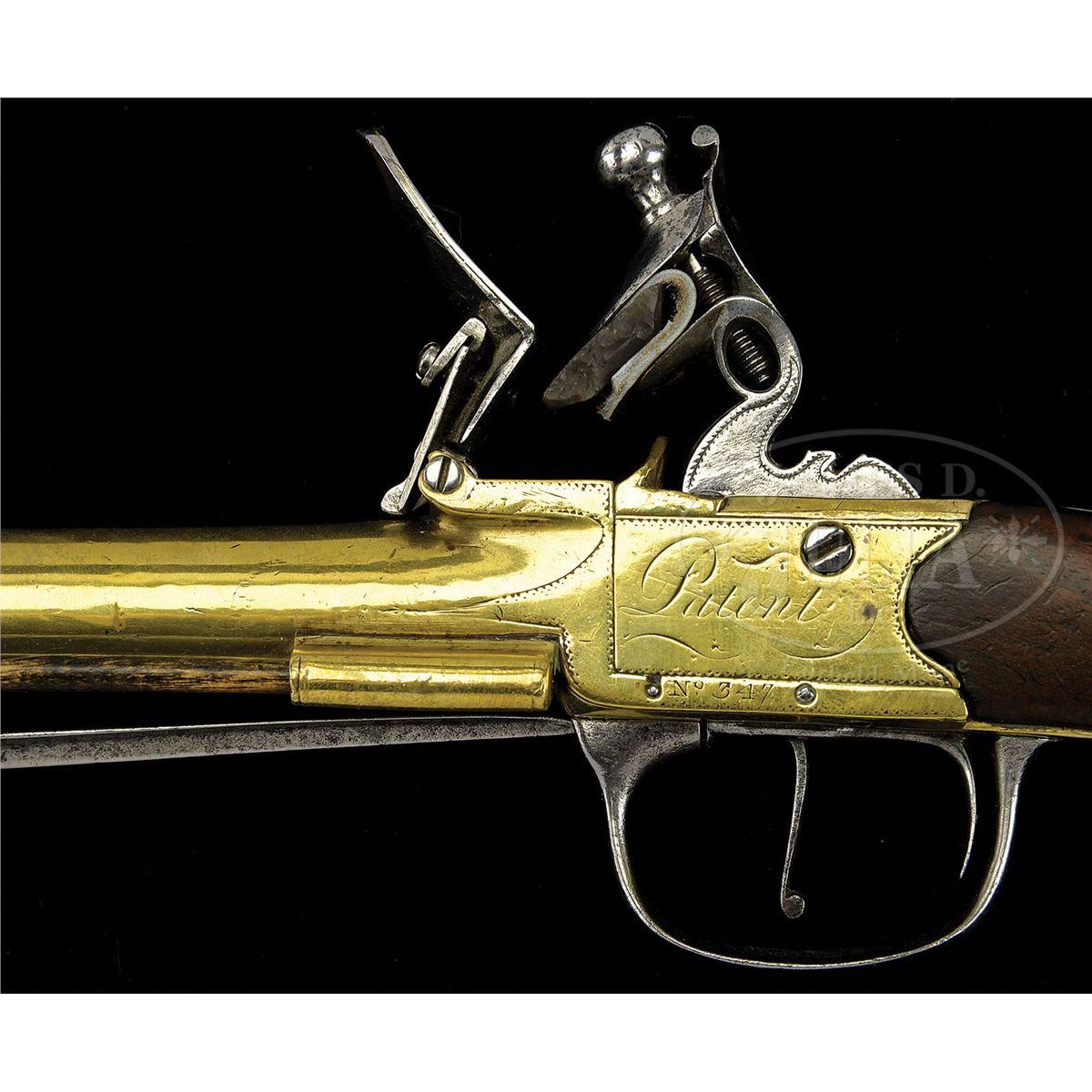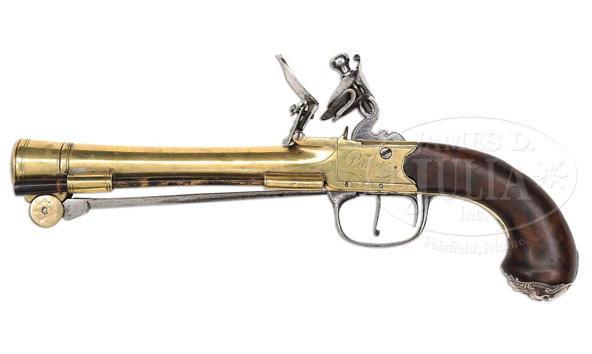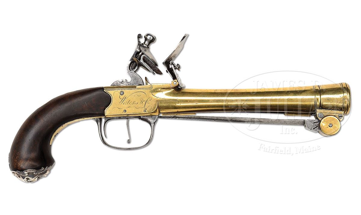 NSN. Cal. 1.030 at muzzle. 7" Flared brass bbl with Birmingham proofs, is integral with boxlock action, which has centrally hung, reinforced cock. Action is engraved "Waters & Co" on right side and "Patent" on left over "No 347", most likely a serial number of his interesting coil spring for actuating under slung folding bayonet. This 7" long bayonet is marked "Tho Gill", and is held in place by secondary "trigger" in guard behind main trigger. A horn tipped ramrod is held by two pipes on left side of bbl. Burl walnut stock has silver grotesque mask fitted to butt, which is stamped with 1780/81 Birmingham hallmarks, and makers mark "C F" (Charles Freeth). Pistol measures 13" overall. CONDITION: Good. Polished brass is beginning to darken, engraving softened. Iron parts cleaned to pewter patina. Silver is fine. Bayonet spring is a bit weak. Lock is crisp. 4-49669 MGM278