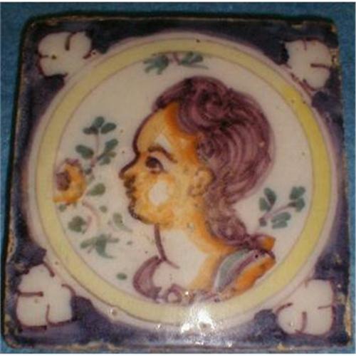 This is a very rare item......an antique ceramic tile with a portrait of a young woman. It is 5 1/4" x 5 3/8" x 9/16" thick. The predominant color is lavendar with white, blue and yellow. I believe it may be English and dates from the very early 19th century and possibly from the 18th century. The condition is very good for its' age, no cracks or breaks, however there is some edge chipping on the back side.