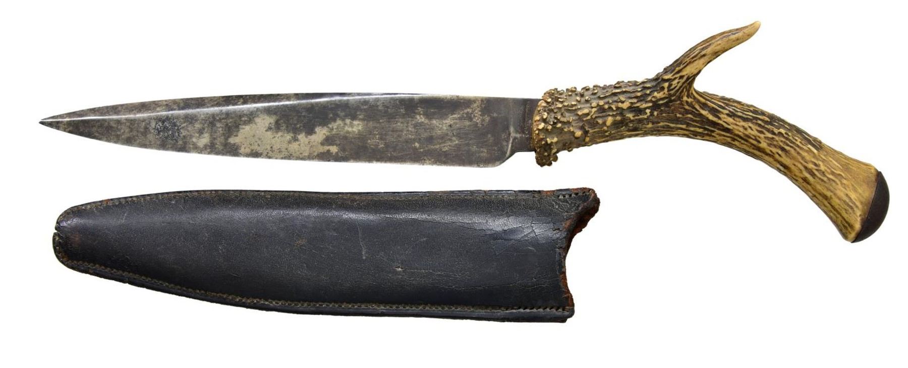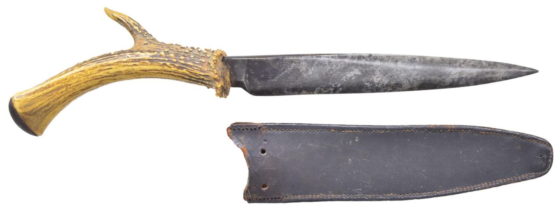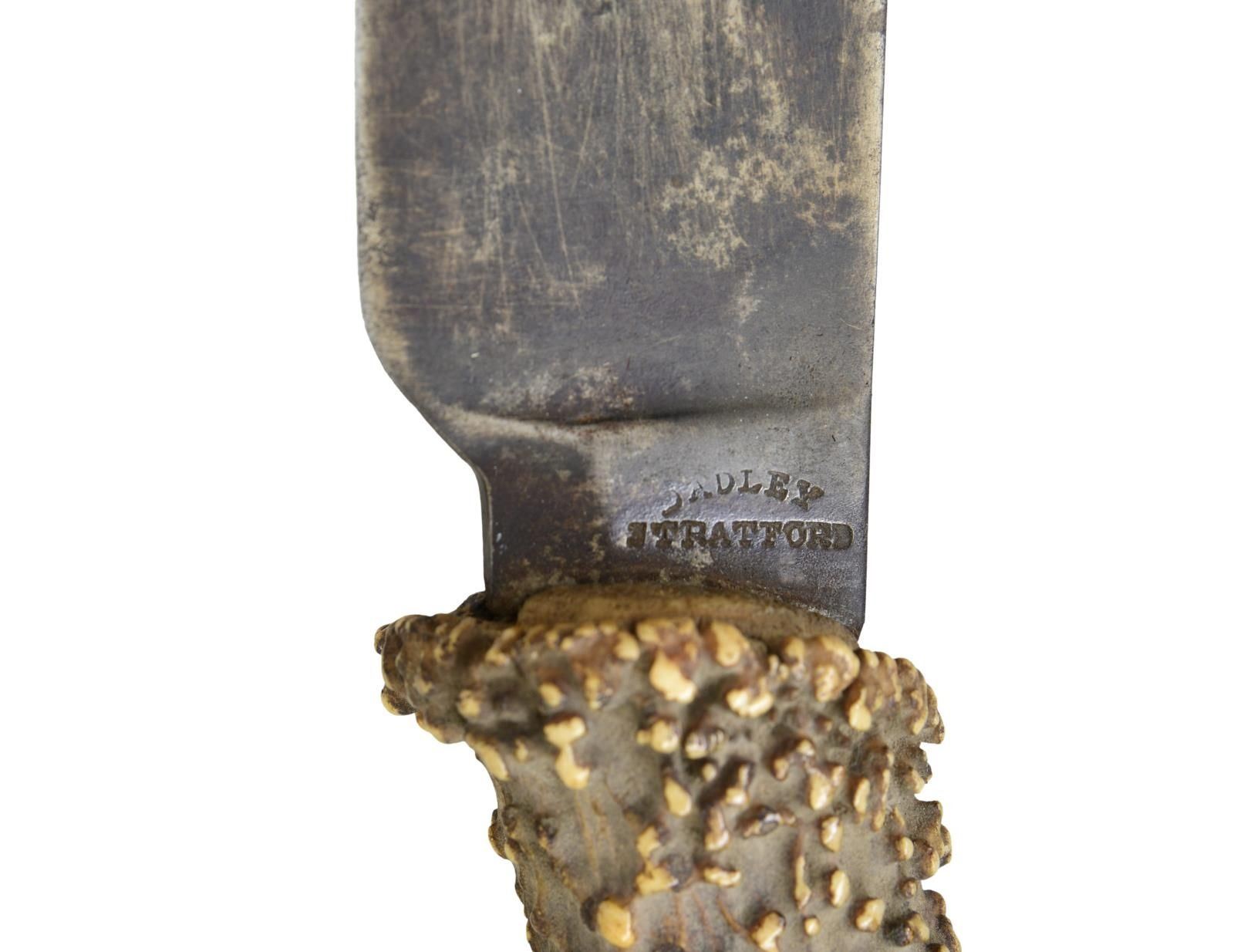 17" overall, 10" blade stamped on ricasso "DADLEY STRATFORD", mounted on branched crown stag grip handle with domed iron pommel cap. William Dadley (1774-1846), Avon on Stratford is listed as only cutler in this town's directory in 1822. Dadley's razors are well known (1810-1830)' but this is the only knife we are aware that has surfaced. The sheath is form fitted to stag grip base. Possibly an American remounting and American leather sheath. CONDITION: very good overall, smooth iron patina, light pitting, pommel cap dark iron patina. Black leather sheath good overall, missing sewn belt attachment, point of knife protrudes. PROVENANCE: From the late Robert Vines Collection. (02-16929/JS). $2,000-4,000.