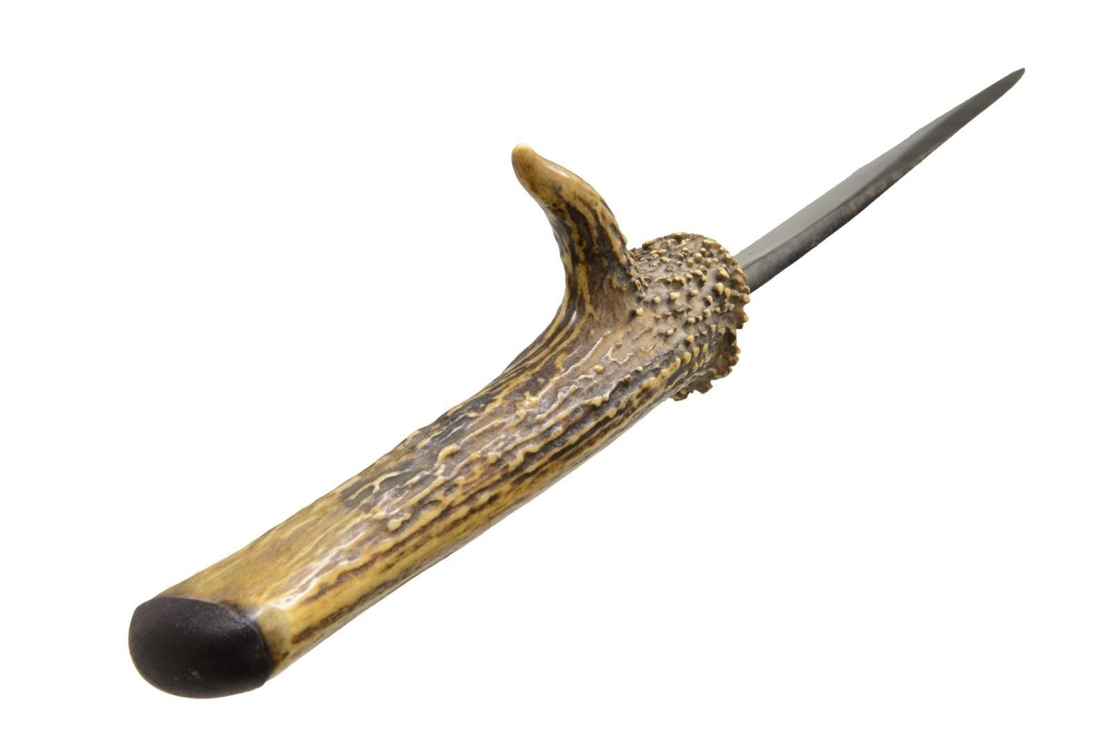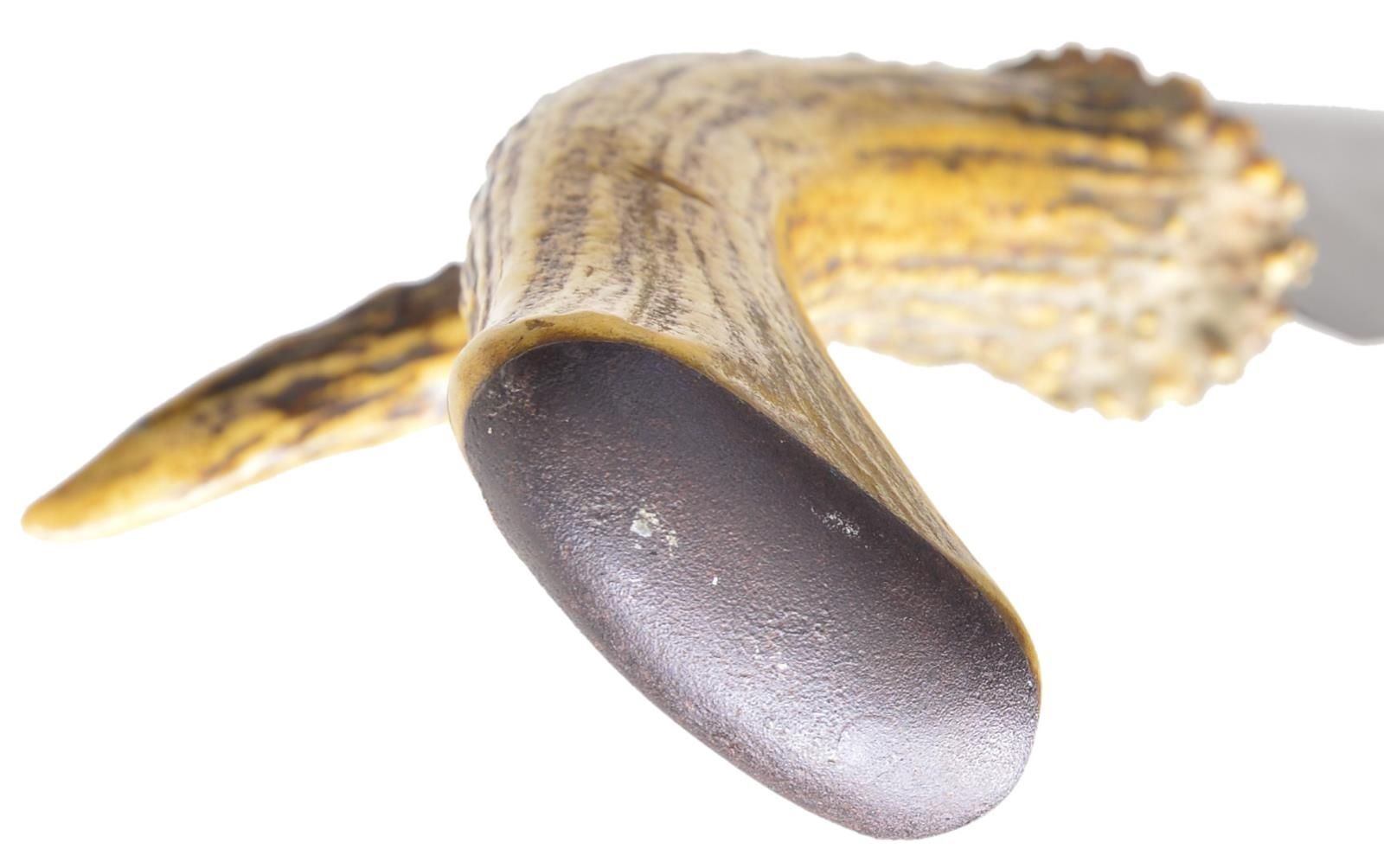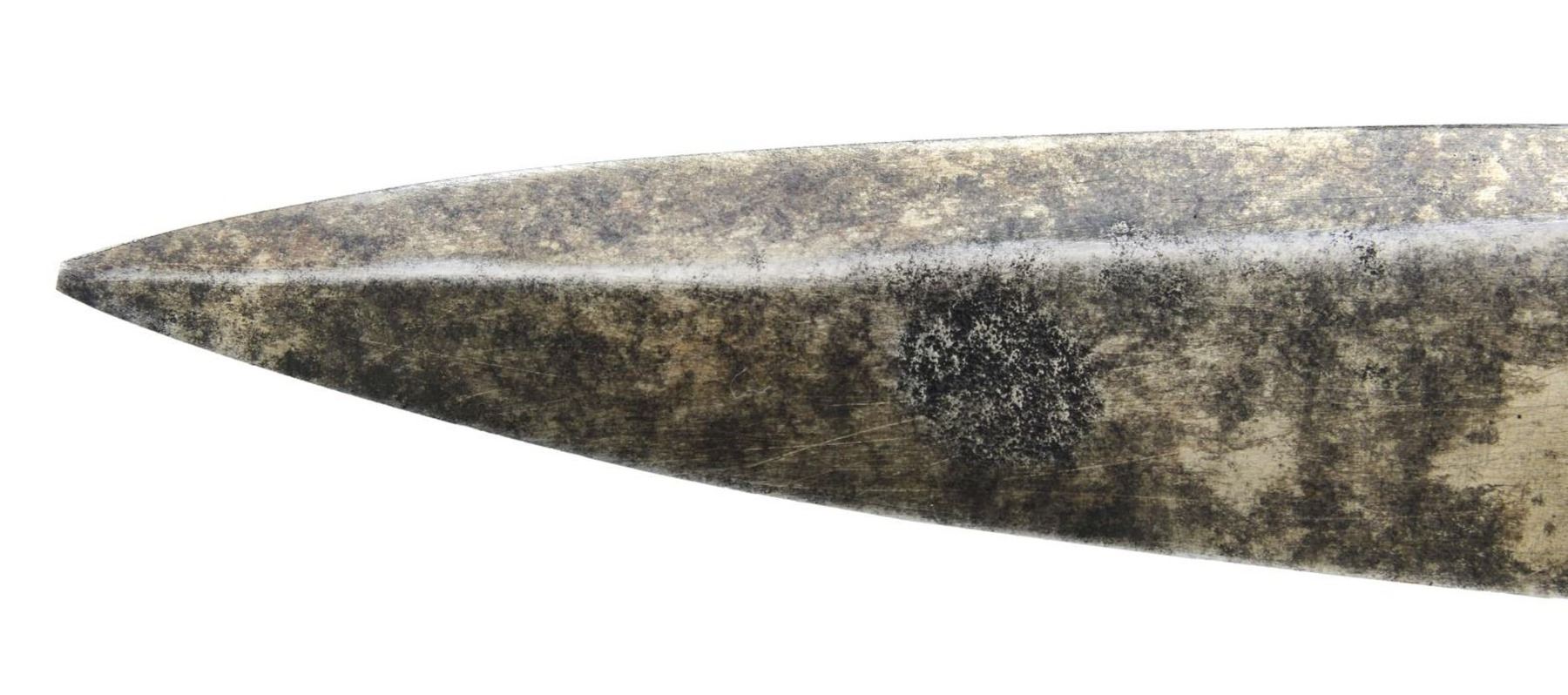 17" overall, 10" blade stamped on ricasso "DADLEY STRATFORD", mounted on branched crown stag grip handle with domed iron pommel cap. William Dadley (1774-1846), Avon on Stratford is listed as only cutler in this town's directory in 1822. Dadley's razors are well known (1810-1830)' but this is the only knife we are aware that has surfaced. The sheath is form fitted to stag grip base. Possibly an American remounting and American leather sheath. CONDITION: very good overall, smooth iron patina, light pitting, pommel cap dark iron patina. Black leather sheath good overall, missing sewn belt attachment, point of knife protrudes. PROVENANCE: From the late Robert Vines Collection. (02-16929/JS). $2,000-4,000.