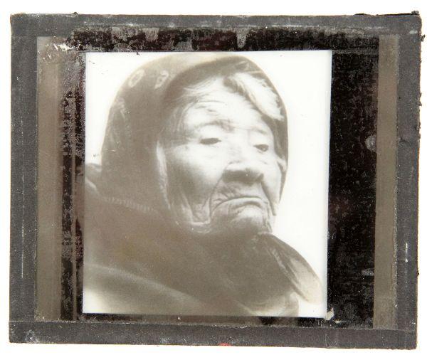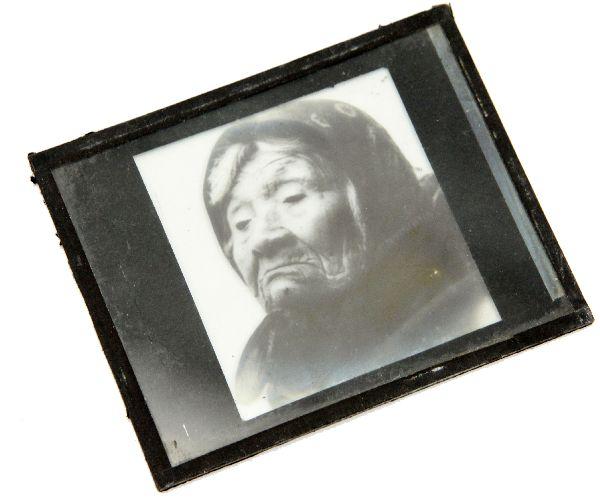 4 X 3 inch double plate glass lantern slide of Chief Seattle's daughter Princess Angeline by Edward Curtis in rare closed mouth portrait. Very good condition with small chip in corner.