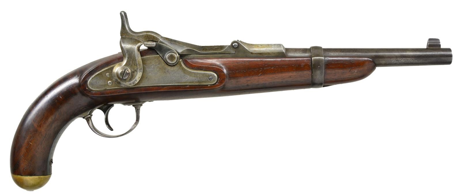 Cal. 50-70. S# 24579. General Wm. Tecumseh Sherman saw potential in this massive pistol made to his design: “I wish you also cause to be prepared as soon as convenient prior to March 1, 1870, a carbine and single barreled pistol with the same of similar breech block as is now used in the Springfield musket, and capable of using the same identical cartridge. I do not suppose one can literally use a musket cartridge in the carbine and pistol, but each could use the same caliber, the same copper case, the powder alone varying in quantity, but the strength of parts should be adjusted so that in emergencies the carbine and pistol could use the musket cartridge.". A small quantity made for trials. This example is pictured & described on page 257 of the 1973 text “The William M. Locke Collection”, “Single shot pistol made from 1869 Trapdoor Springfield rifle, 9” round barrel. Caliber 50/70, serial number 24579. Lock plate marked in front of cock with eagle & “U. S. SPRINGFIELD” behind cock “1863””. CONDITION: very good overall, stock well fit and sound with minor cosmetic blemishes, metal mottled gray overall, light pitting, traces of case color on breech & tang. (01-21490/JS). $10,000-20,000.