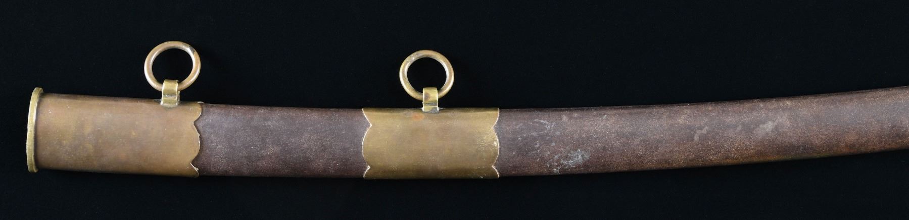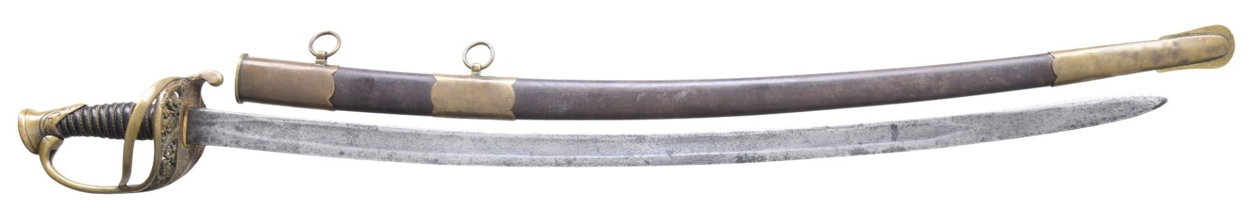 SWORD. Only a handful of this pattern are known, made in deep south, probably by Louis Bissonnet in Mobile, but often attributed to Leech & Rigdon. The original Confederate brass mounted iron scabbard has figured mounts found on other known Leech swords & sabers. Hilt exhibits a relief cast "CS" in oval frame on top of guard with an extra added branch found on a few inscribed swords with extra polish and finish like this example. The blade etch is heavily worn and presentation is not discernible. UNATTACHED ACCESSORIES: copy of Heritage Auctions, results & description from Don Tharpe collection, lot 72247, Dec. 1, 2007. CONDITION: very good overall, hilt, grip, and scabbard are fine, good patina, polished wood grip retains most of its black dyed surface with tightly wrapped original twisted brass wire. 30" blade is cleaned, pitted, with discernable traces of whimsical etching characteristic to Louis Bissonnet. Similar swords are known presented to generals and other high rank officers. PROVENANCE: Lifelong collection of Richard A. Baumann. (02-23363/JS). NON-GUN. $12,000-20,000.
