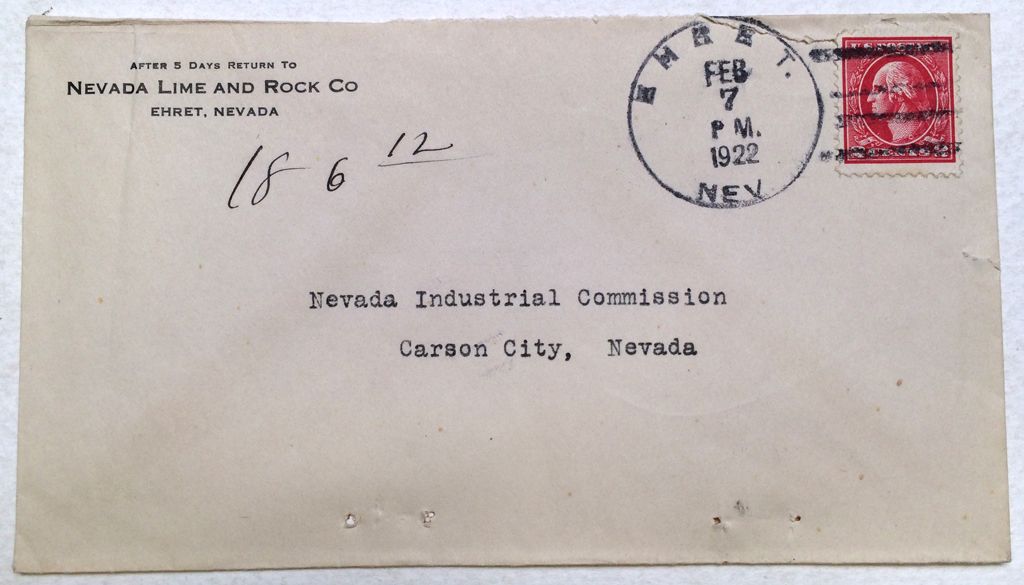 Strong February 7, 1922 cancel. Cc of the Nevada Lime & Rock of Ehret. R-7.
