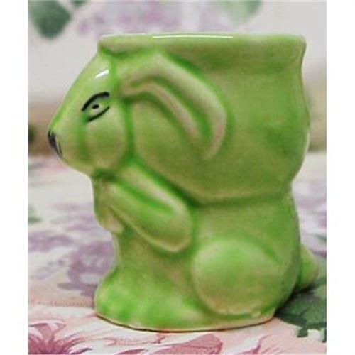 THIS IS RARE FIGURAL EGG CUP, MADE BY ROYAL ART POTTERY, LONGTON, ENGLAND, DEPICTING CUTE BUNNY SUPORTING THE EGG CUP, HIS FACE IS HAND PAINTED, THE CUP IS FINISHED IN A LOVELY HIG GLOSS GREEN GLAZE, MEASURES ABOUT 2 1/2" HIGH, EXCELLENT CONDITION,BUT FOR TINY IMPERFACTION INSIDE THE RIM - FROM THE MOLD,US BUYER TO PAY 7.00 FOR SHIPPING PLUS INSURANCE.THANK YOU.