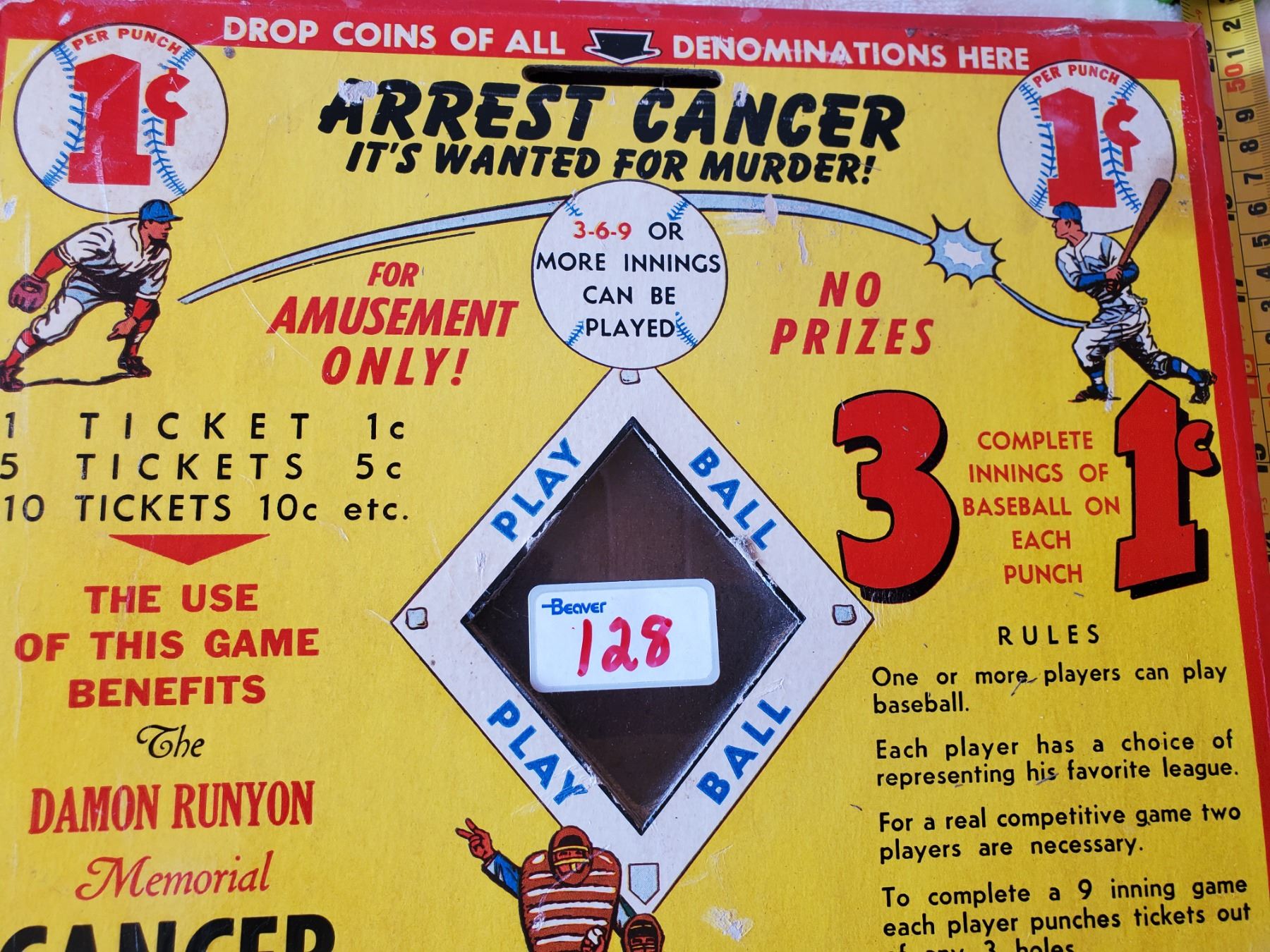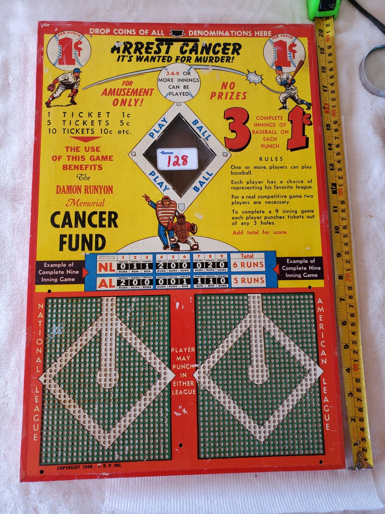 RARE FIND 1948 CANCER FUND BASEBALL GAME PUNCH IN BOARD-NEW MINT-UNUSED