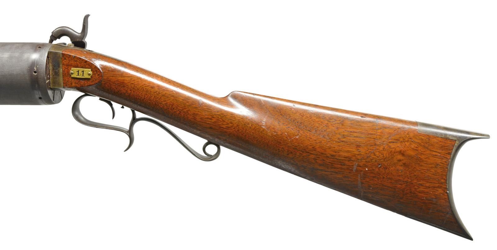 MARYSVILLE, CALIFORNIA PILL LOCK REVOLVING RIFLE. Cal. 46. NSN. Overall 52.5". Bbl. 32.75" oct., stamped on top flat "B. BIGELOW, MARYSVILLE, CAL”. Benjamin Bigelow arrived in California in 1849 at the height of the gold rush & established a popular gun making trade till his death in 1888. Bigelow had previously apprenticed w/ William Billinghurst for 12 years learning the gun trade. Bigelow’s revolving rifle operates much like Billinghurst’s which used the Miller patent (1829) hand-turned cyl. & “mercury fulminate pill” ignition. Back action lock, iron mounted, walnut stock, blued bbl. & cyl.; case colored lock, frame, triggerguard, patchbox, & buttplate. The only markings other than maker’s name on bbl. is the back of the cyl. w/ corresponding 1-7 for each chamber & removable screwed-in plug. Very few Miller patent rifles were made, most by Billinghurst, no more than 2 or 3 are known by Bigelow & this is a very fine example retaining much of its original finish. Jim Servin wrote an interesting 1964 article on the California gun trade which is linked given the history of Benjamin Bigelow & his firearms production in the gold fields of California. UNATTACHED ACCESSORIES: 1999 appraisal document. CONDITION: fine to excellent overall, complete & original. Original blue to the bbl. & cyl. mostly turned plum, case colors mostly muted w/ balance mottled silver/gray. Stocks retain old varnish w/ minor cosmetic dings & dents, mechanically fine, crisp rifled bore w/ areas of pitting. Buckhorn rear sight, missing front sight, has dovetail slot. Patchbox mortise retains old, waxed patches. Original brass tipped ramrod has 3 piece iron/brass end w/ worm. There is an old sm. brass collection number “11” tacked to left side of stock. (01-18841/JS). ANTIQUE. $7,000-9,000.