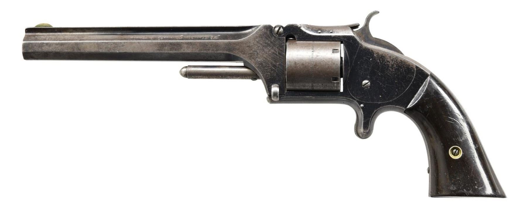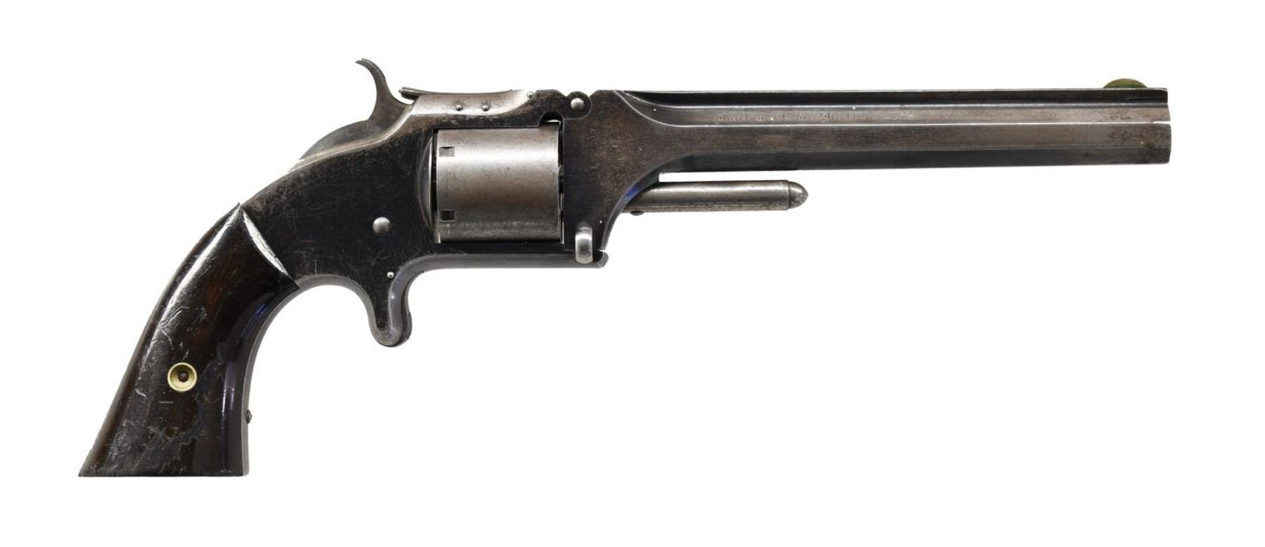 2 ARMY REVOLVER. Cal. 32, S# 70480. This revolver is featured in November 2006 Gun Report article by Mike Bricker, in standard late configuration, 6" barrel, one line address, patent marked cylinder. This revolver was made in the last year of manufacture of this model, 1870. It has the late features of knurled trigger and heavier, thicker grips with concave escutcheons. The barrel is engraved on both top flats with Paris agent and address. UNATTACHED ACCESSORIES: copy of November 2006 Gun Report article "Some Early Smith and Wesson Export Revolvers". CONDITION: fine overall, complete & matching serial numbers and assembly markings Revolver retains about 60% of its original fading blue finish, markings all crisp and discernible. About 90% of the factory varnish is retained on rosewood grips. Mechanically fine, crisp shiny rifled bore. PROVENANCE: Butterfield & Butterfield Auction, February 2001; Lifelong collection of Robert "Mike" Bricker. (01-24958/JS). ANTIQUE. $800-1,200.