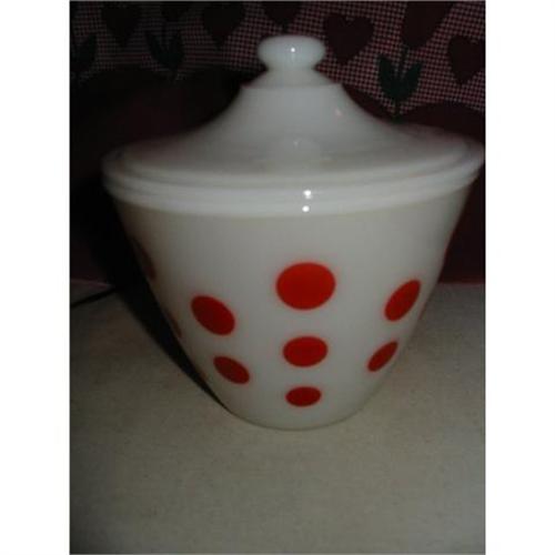 This RARE Fire King Red Dots on White Grease Jar With lid is in Excellent Collectible Condition. The grease jar is clean and shiny with no evidence of previous usage. 5'' There are no chips, rim roughness, cracks, stains, or utensil marks. The fired-on red polka dots are bright and vivid with no scratch marks or fading. The bottom of the grease jar is marked, 'Fire King Oven Ware.' A GREAT addition to your collection of Fire King grease jars! I added a photo of a matching pepper shaker listed on my site--save on shiping if you buy both of them.