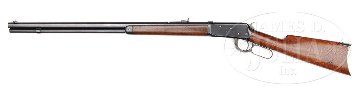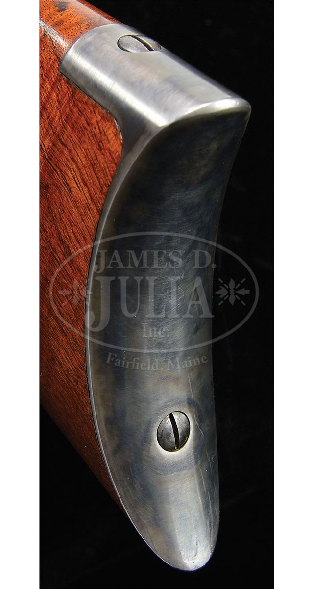 SN 1326. Cal. 38-55. Rare first model standard grade rifle with 26" oct bbl, full magazine, ivory bead combination front sight and semi-buckhorn rear sight. Receiver is first type with exposed cartridge guide screw heads on the outside. Right side of upper tang, under the wood, has the assembly number "412". Matching assembly number is also found in top tang channel of the buttstock. Buttstock is somewhat unusual in that it is without a lightning hole under the buttplate. Buttplate is without assembly number but appears to be the orig to this rifle. Mounted with nicely figured, uncheckered straight grain American walnut with straight stock & crescent buttplate. Accompanied by a Cody Firearms Museum letter identifying this rifle, as found, received in warehouse Jan. 2, 1895 and shipped Jan. 24, 1895 to Order #6587. PROVENANCE: Wes Adams Estate Collection. CONDITION: Extremely fine. Bbl & magazine tube retain about 98% crisp orig blue with some very fine, scattered spots of discoloration; forend cap retains 96-98% strong orig blue with some very minor flaking; receiver retains 95-97% bright orig blue with very light edge wear and some very minor flaking, stronger on right side; lever & hammer retain brilliant case colors on the sides, moderately faded on outer faces of lever; buttplate retains about all of its moderately to heavily silvered case colors. Wood is sound with a very few, very minor scattered light nicks & scratches and overall retains virtually all of its orig factory finish. Mechanics are crisp, brilliant shiny bore, shows very little use, retaining most of the orig factory blue on bolt face and slightly thinned fire blue on loading gate. This may be one of the finest standard grade first model '94s extant. 4-44395 JR18