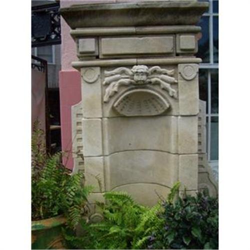 17th century inspired wall fountain or planter with an inset of a cherub on a scallop shell. This fountain would be wonderful with a sheer descent water feature cascading into its basin.