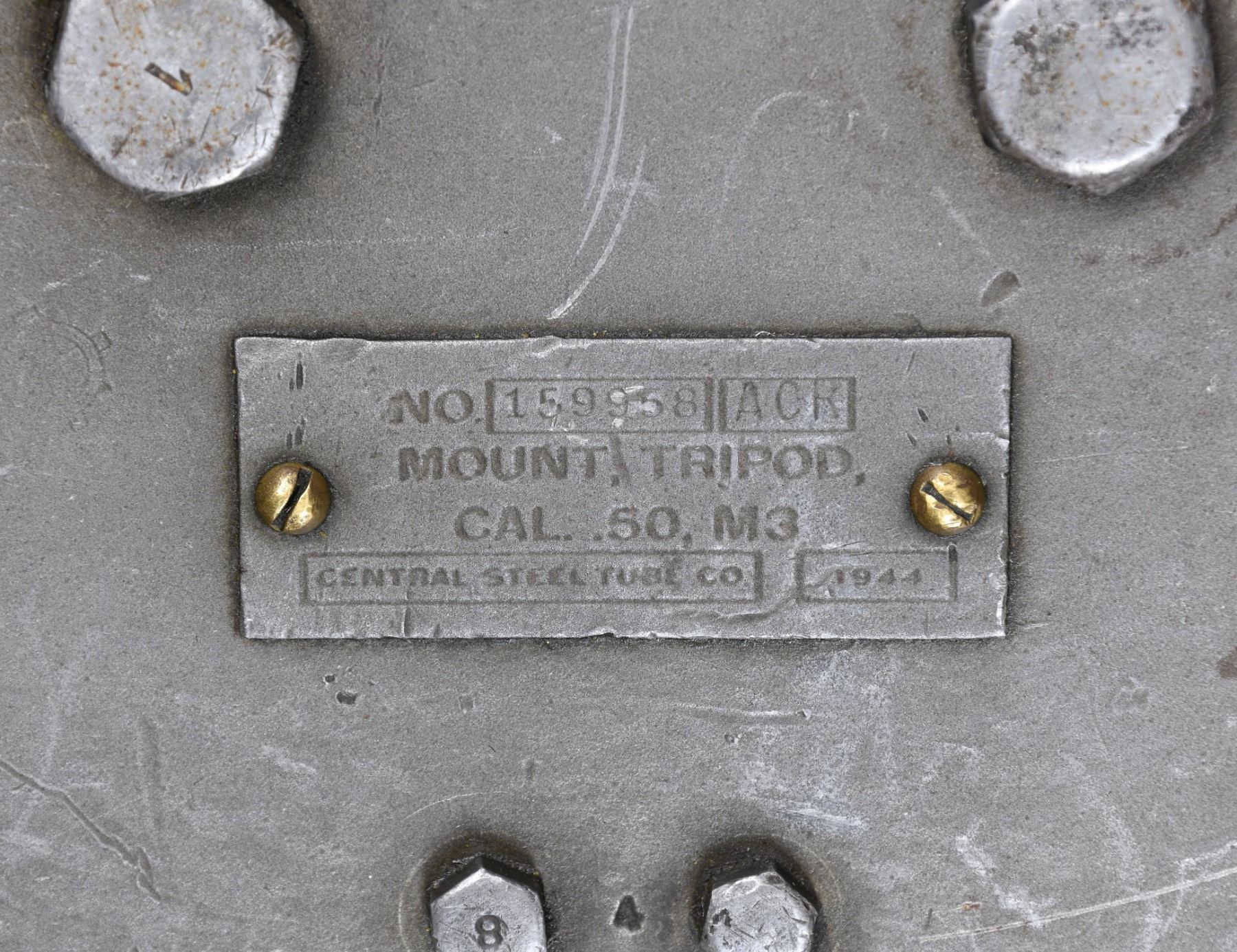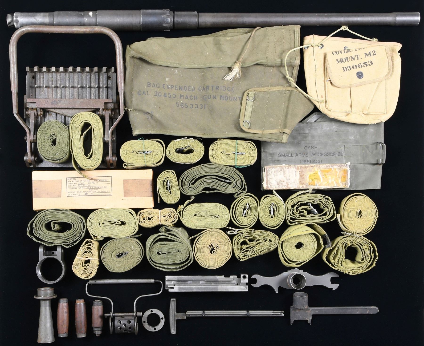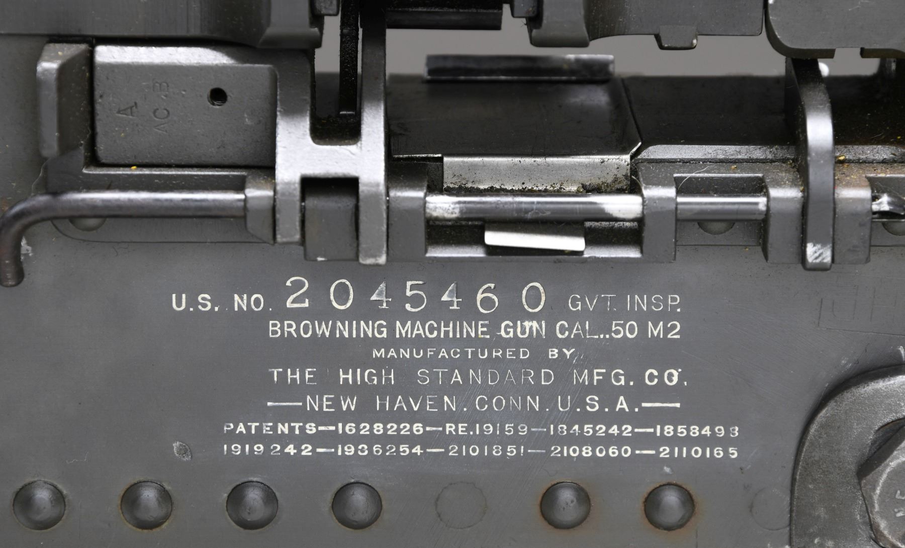 Cal. 50 BMG. S# 003477. Bbl. 45". The Browning M2HB, affectionately referred to in military circles as "Ma Duece" is another evolution of the successful John Browning designed, recoil operated & belt fed guns that populated the battlefields following WWI. In an effort to build a gun that was comparable to the French 11mm Hotchkiss, w/ a primary purpose of deflating observation balloons & disabling aircraft, the .50 BMG was designed and introduced for the M1921A1, which was quickly modified & reintroduced as the M2. Barrel heating issues would lead to the heavy barrel version that we now know as the M2HB. There were several manufacturers of the M2HB including High Standard, best known today for their high end, accurate .22 pistols. This beautiful example has a parkerized finish on all exterior surfaces. Hooded front sight blade w/ coinciding rear ladder sight adjustable to 2600 meters. 10" ventilated barrel shroud. Spade grips w/ "butterfly" thumb trigger. Manufacturers markings on right sideplate clean & crisp. Right sideplate marked: "U.S. NO. 2045460 GVT. INSP. / BROWNING MACHINE GUN CAL. .50 M2 / MANUFACTURED BY / THE HIGH STANDARD MFG. CO. / NEW HAVEN, CONN. U.S.A." w/ patent block. Gun currently rests on an original M3 tripod, manufactured in 1944 by the Central Steel Tube Company. Data plate still intact, marked as follows; "NO. 159958 ACR / MOUNT, TRIPOD / CAL. .50. M3 / CENTRAL STEEL TUBE CO. 1944". MAGS: 22 tan & green cloth belts of varying lengths. UNATTACHED ACCESSORIES: Military M7 Linking / Delinking Machine, 1 spare bolt, 1 spare barrel, 1 spare set of wood for spade grips & charging handle, 1 spare muzzle booster, 5 spare recoil springs, 2 cleaning rod sets (1 new, unopened), 3 different armorers wrenches, 3 original canvas bags for Tripod mount, 1 for spent casings, & 1 accessory pouch. CONDITION: Finish on exposed metal surfaces complete & consistent. Appearing to have been refinished. rFinish is as nice n any original M2HB this cataloger has seen. Hardwood spade grips & charging handle in nice condition, w/ some typical impressions. Tripod moves as intended, smooth & fluidly, & T&E mechanism is tight & smooth. Some scattered staining & patina on leg surfaces, which appear to be of original finish. Markings on right sideplate are clear, crisp & easy to read, currently highlighted in white. Bores are bright on both barrels, w/ strong rifling. Fire control mechanism appears to function correctly when cycled by hand. NATIONAL FIREARMS ACT MG REQUIRING BATF TRANSFER BEFORE TAKING POSSESSION. FULLY TRANSFERABLE. PROVENANCE: From the Lifelong Collection of Brian Linde. (03-1812/JZ). CURIO CLASS III. $50,000-80,000.