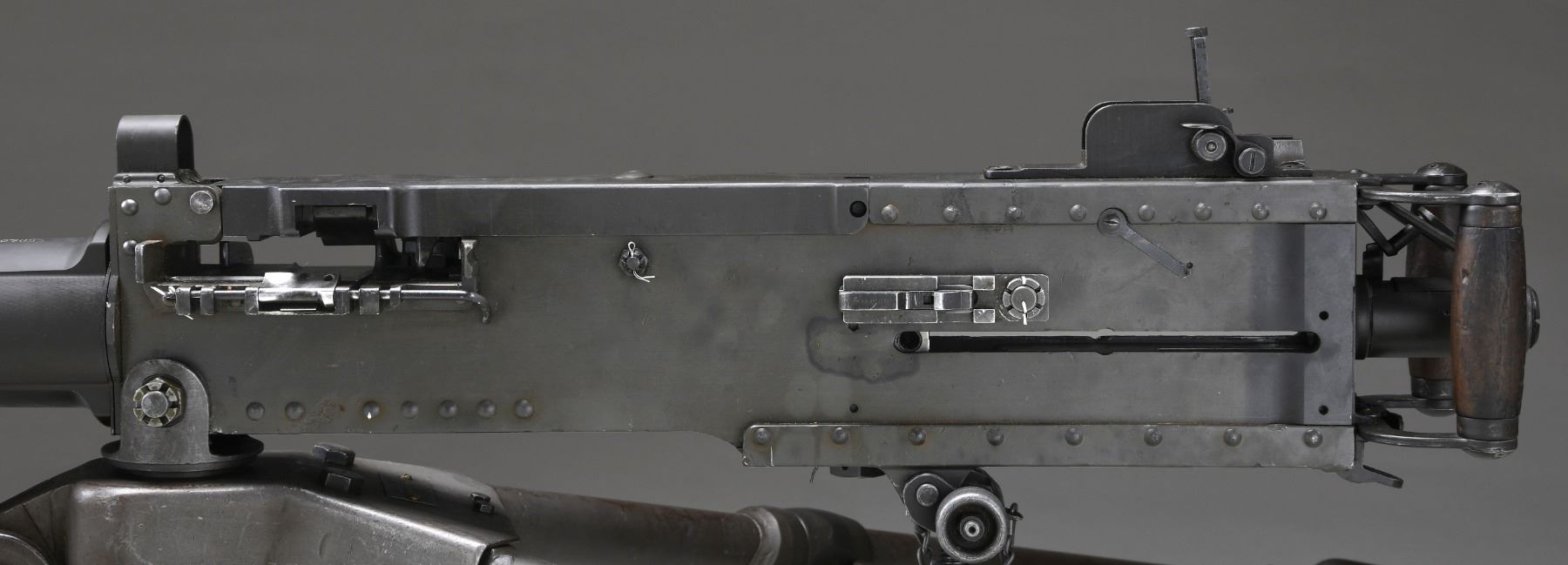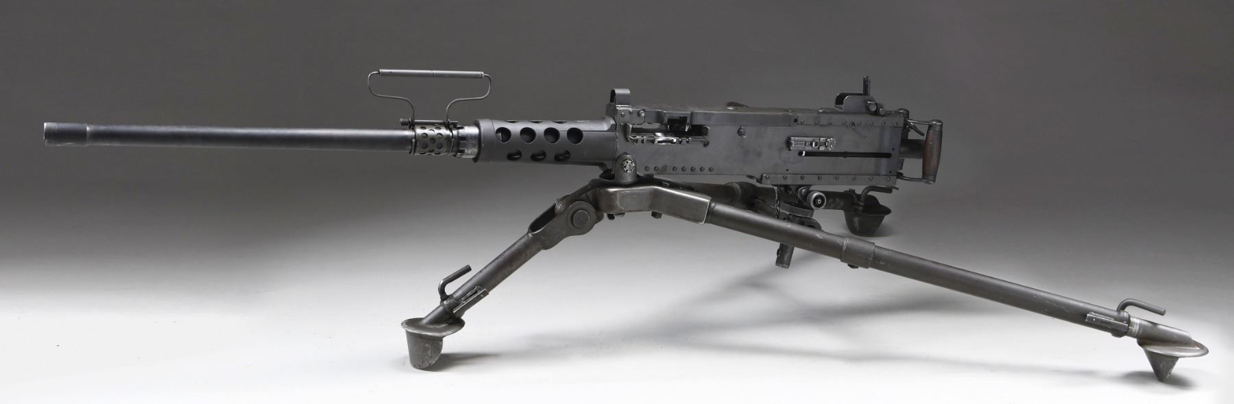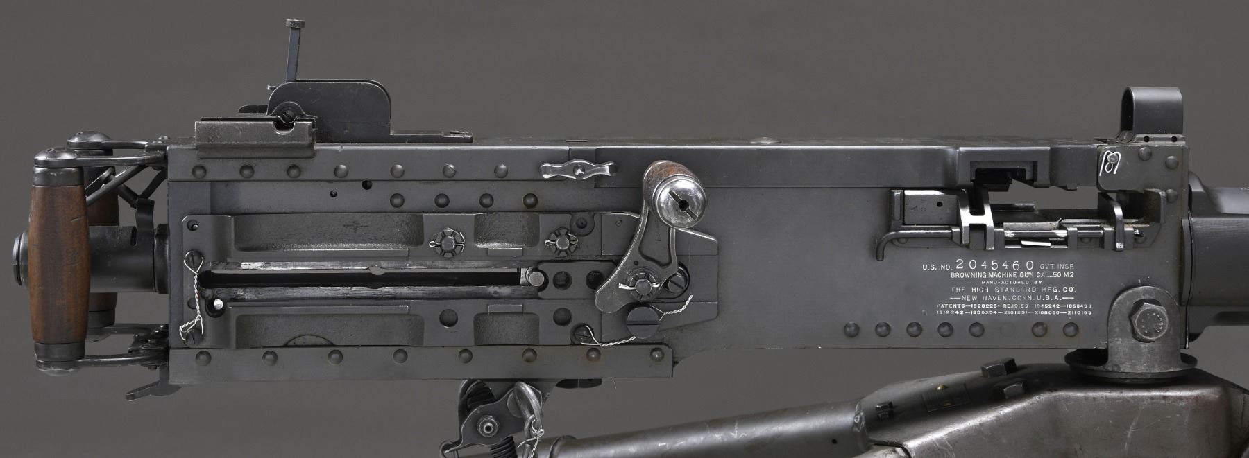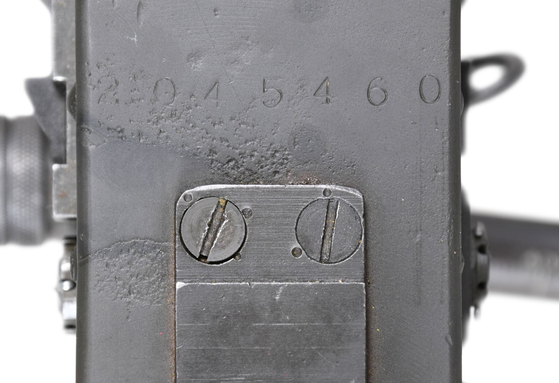 Cal. 50 BMG. S# 003477. Bbl. 45". The Browning M2HB, affectionately referred to in military circles as "Ma Duece" is another evolution of the successful John Browning designed, recoil operated & belt fed guns that populated the battlefields following WWI. In an effort to build a gun that was comparable to the French 11mm Hotchkiss, w/ a primary purpose of deflating observation balloons & disabling aircraft, the .50 BMG was designed and introduced for the M1921A1, which was quickly modified & reintroduced as the M2. Barrel heating issues would lead to the heavy barrel version that we now know as the M2HB. There were several manufacturers of the M2HB including High Standard, best known today for their high end, accurate .22 pistols. This beautiful example has a parkerized finish on all exterior surfaces. Hooded front sight blade w/ coinciding rear ladder sight adjustable to 2600 meters. 10" ventilated barrel shroud. Spade grips w/ "butterfly" thumb trigger. Manufacturers markings on right sideplate clean & crisp. Right sideplate marked: "U.S. NO. 2045460 GVT. INSP. / BROWNING MACHINE GUN CAL. .50 M2 / MANUFACTURED BY / THE HIGH STANDARD MFG. CO. / NEW HAVEN, CONN. U.S.A." w/ patent block. Gun currently rests on an original M3 tripod, manufactured in 1944 by the Central Steel Tube Company. Data plate still intact, marked as follows; "NO. 159958 ACR / MOUNT, TRIPOD / CAL. .50. M3 / CENTRAL STEEL TUBE CO. 1944". MAGS: 22 tan & green cloth belts of varying lengths. UNATTACHED ACCESSORIES: Military M7 Linking / Delinking Machine, 1 spare bolt, 1 spare barrel, 1 spare set of wood for spade grips & charging handle, 1 spare muzzle booster, 5 spare recoil springs, 2 cleaning rod sets (1 new, unopened), 3 different armorers wrenches, 3 original canvas bags for Tripod mount, 1 for spent casings, & 1 accessory pouch. CONDITION: Finish on exposed metal surfaces complete & consistent. Appearing to have been refinished. rFinish is as nice n any original M2HB this cataloger has seen. Hardwood spade grips & charging handle in nice condition, w/ some typical impressions. Tripod moves as intended, smooth & fluidly, & T&E mechanism is tight & smooth. Some scattered staining & patina on leg surfaces, which appear to be of original finish. Markings on right sideplate are clear, crisp & easy to read, currently highlighted in white. Bores are bright on both barrels, w/ strong rifling. Fire control mechanism appears to function correctly when cycled by hand. NATIONAL FIREARMS ACT MG REQUIRING BATF TRANSFER BEFORE TAKING POSSESSION. FULLY TRANSFERABLE. PROVENANCE: From the Lifelong Collection of Brian Linde. (03-1812/JZ). CURIO CLASS III. $50,000-80,000.