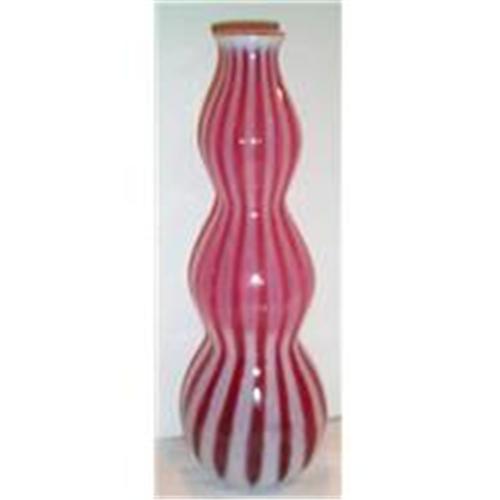 This very unusual and quite lovely and RARE Cranbery Striped Vase is in SUPERIOR condition with no chips, cracks, or dings and it measures 4" in diameter at its widest point and stands a very stately 12" tall. This vase was manufactured by Fenton Glass Company.