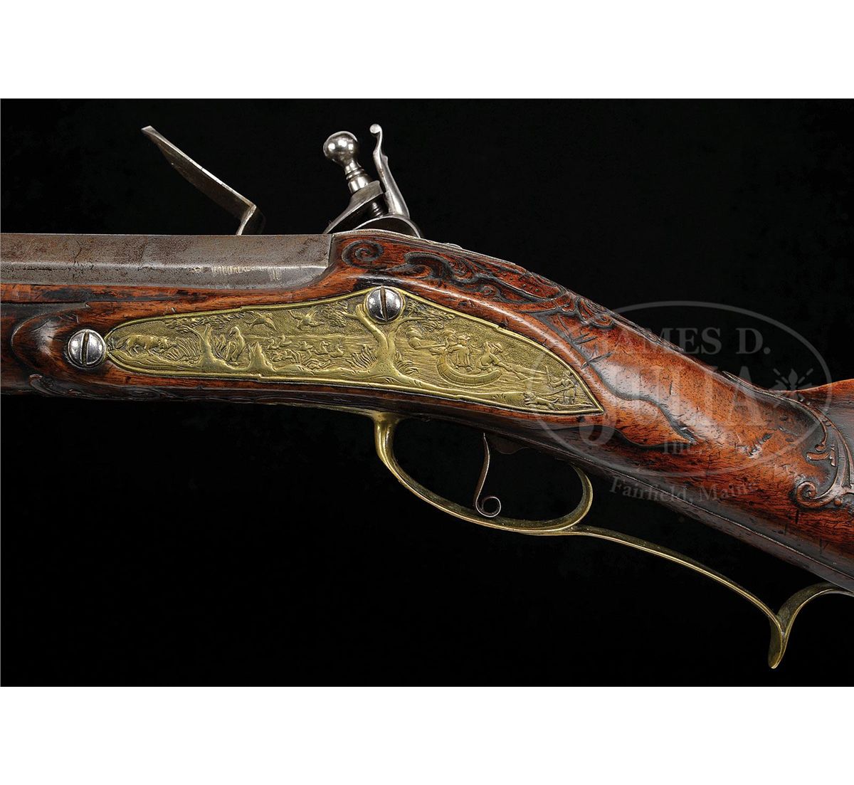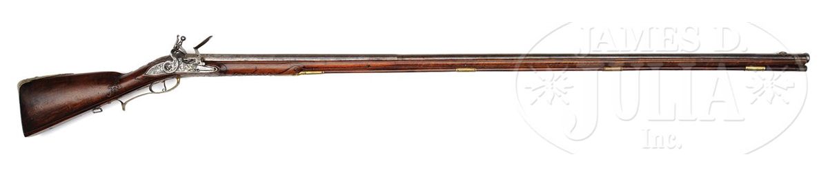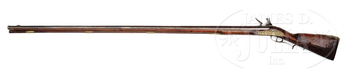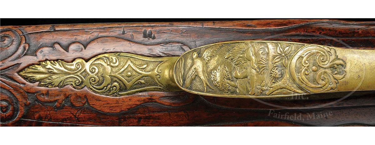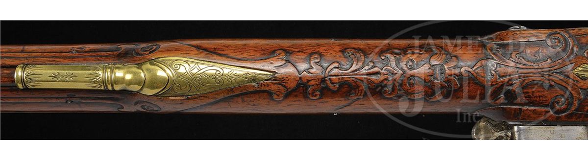 NSN. An extremely rare rifle by one of Bohemia's most distinguished early gun makers. Lock and cock are finely relief chiseled with hunting scenes and animals. Brass mounts are cast and chased with hunting scene involving fowling. Buttplate, cast and chased with exotic birds. The oct to rnd bbl is exceptionally long measuring 55". The full stock is finely raised carved with scrolls and a grotesque mask behind the trigger guard. NOTES: although the bbl appears to be rifled for it's full length, the lack of traditional wheel lock type rear sight and motifs of fowling indicate that this rifle was made primarily for bird shooting. This rifle appears as plate 4 in Henry Kauffmam's book The Pennsylvania/Kentucky Rifle. As such this rifle should be of interest to collectors of Kentucky rifles. PROVENANCE: Collection of Dr. Douglas Sirkin. CONDITION: Lock is excellent with little to no pitting. Bbl is good with extremely fine pitting throughout and some raised surface rust. Stock is extremely crisp with well defined and sharp carving throughout. Ramrod appears to be the orig. 4-49754 MRZ80