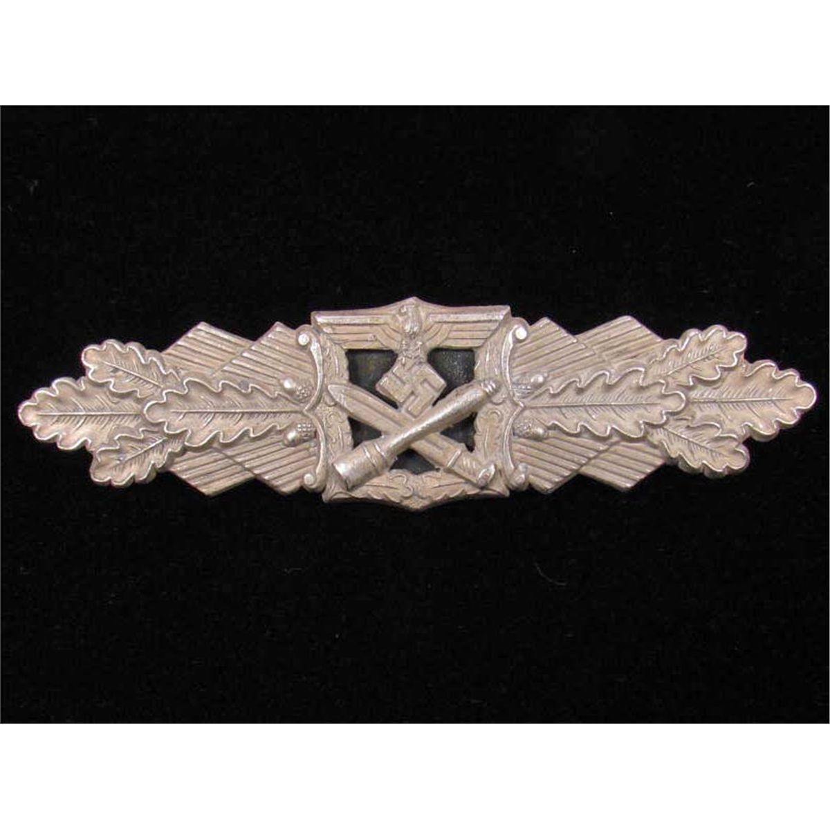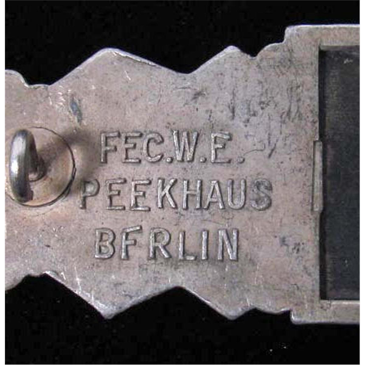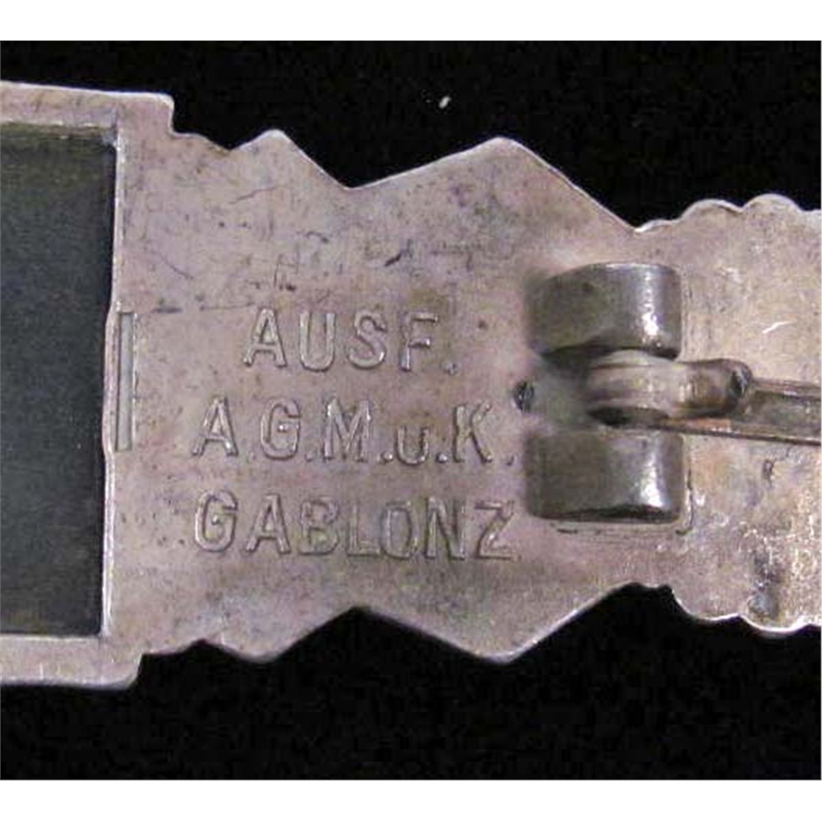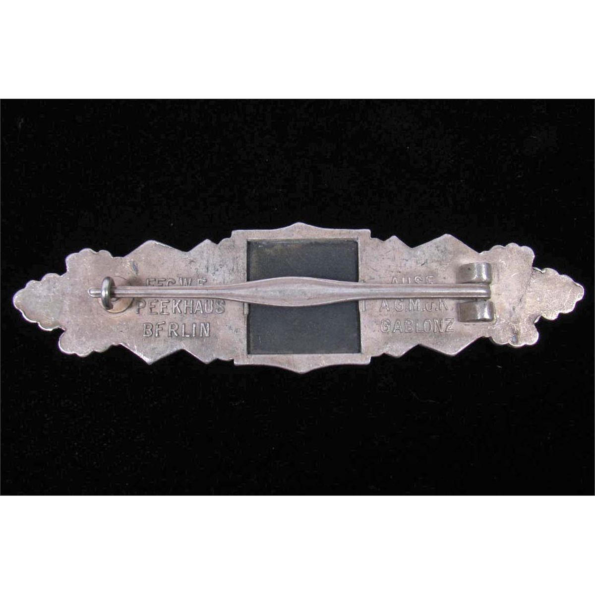 Measures 3 3/4" wide. Maker marked Fed W E Peekhaus Berlin Ausf A G M u K Gablonz. Has a wide fluted horizontal pin back. Awarded for 30 days close combat.