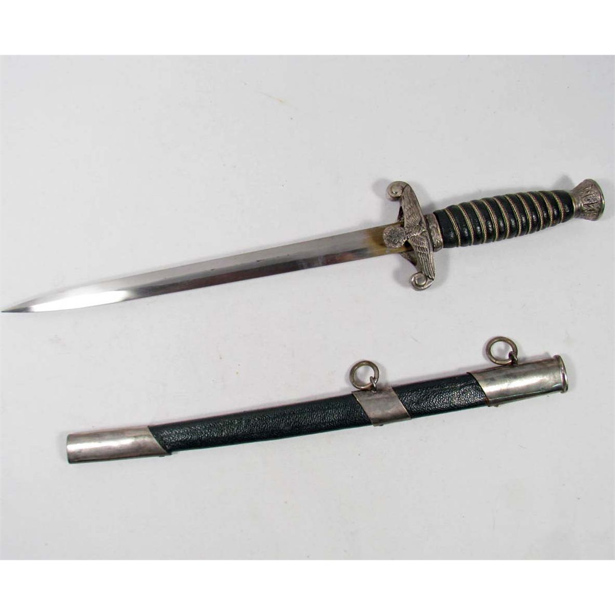 Measures 16" long overall. The blade is maker marked F W Holler Solingen. Has a thermometer logo in the center of the oval. Has a green leather covered handle and scabbard. The fittings are nickel construction with a steel blade.