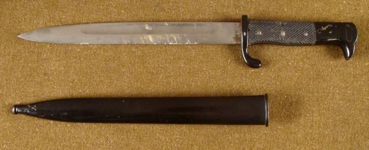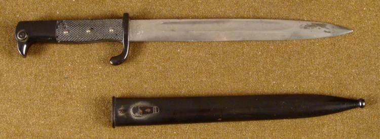 THIS IS A RARE GERMAN WEIMAR PERIOD DRESS BAYONET AND SCABBARD WITH CORRECT BLACK FITTINGS. IT HAS THREE RIVET GRIP, WITH SLIGHT DAMAGE TO THE GRIP. THE POMMEL & CROSS GUARD ARE PERIOD PAINTED BLACK. INLAID RICASSO HAS EARLY KING & KNIGHT LOGO. BLADE IS SLIGHTLY LOOSE IN SCABBARD *