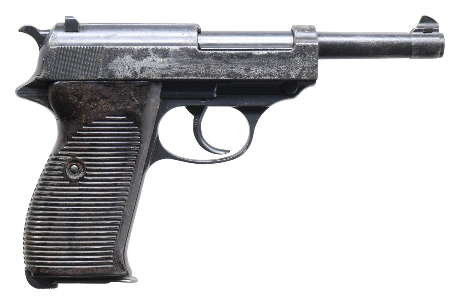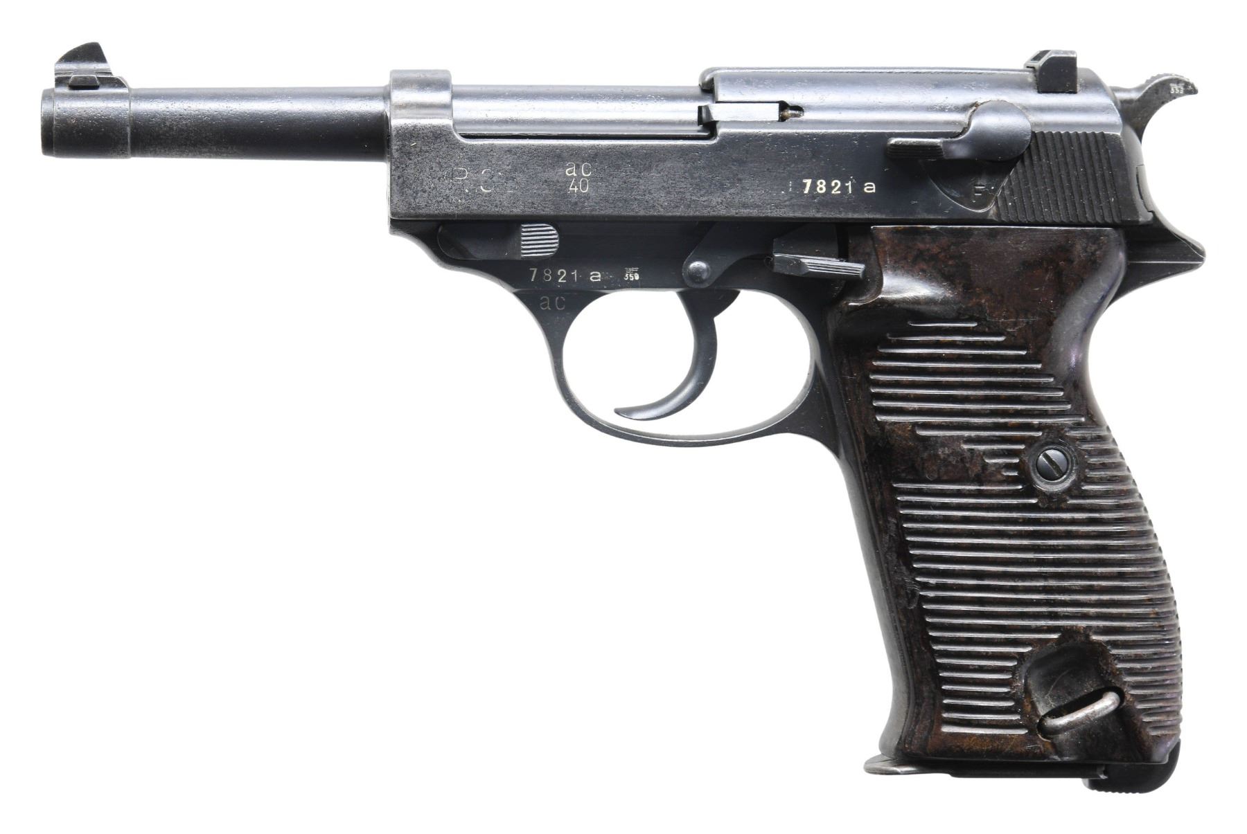 SEMI-AUTOMATIC PISTOL. Cal. 9x19mm. S# 7821a. Bbl. 4 7/8". P.38 semi-automatic pistol mfg. by Walther in 1940. Left side of the slide is marked "P.38", followed by Walther's mfg. code and the 2-digit year of mfg. "ac/ 40", and the S#, with partially discernible Eagle/359 acceptance proofs and an eagle firing proof marked on the right. Left side of the forward trigger guard web is stamped "ac", which is repeated on the underside of the bbl. lug. Metal components exhibit a reapplied blue finish overall. Frame is mounted with 2-piece grooved brown pressed resin grips. Standard dovetailed blade front sight and U-notch rear sight. All serialized parts are matching and include the frame, slide, bbl., and locking block. MAGS: 1 blued 8-rd. mag., stamped with non-matching S# "2505" on the floorplate. CONDITION: metal components retain large amounts of their reapplied blue finish, showing areas of wear fading to gray patina, with scattered spots, patches, and areas of light to mild pitting present beneath the bluing and in worn areas overall. Bore is bright, exhibiting consistent dark surface surface oxidation, while retaining well defined rifling throughout. Proper manual mechanics, to include the safety / decocking lever. Grips show scattered marks from handling and storage, but otherwise remain sound. (25-5126/MLW). CURIO. $800-1,200.