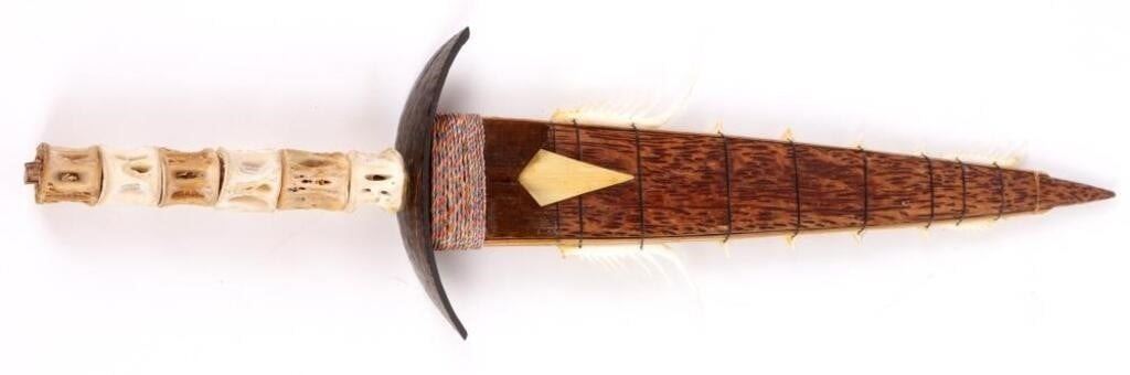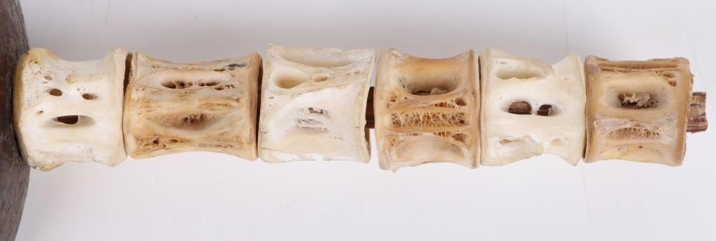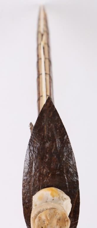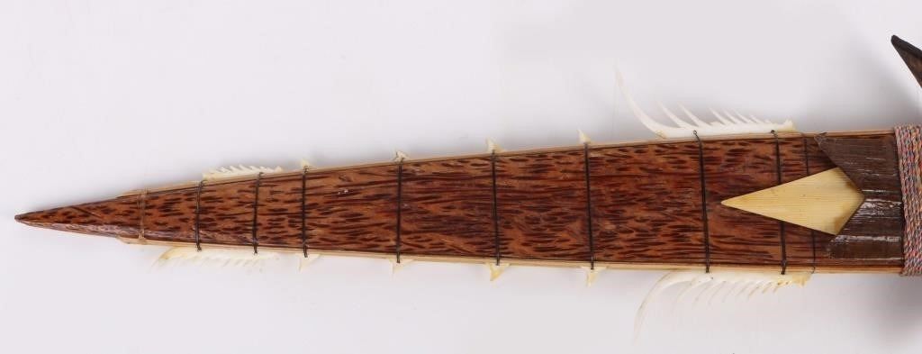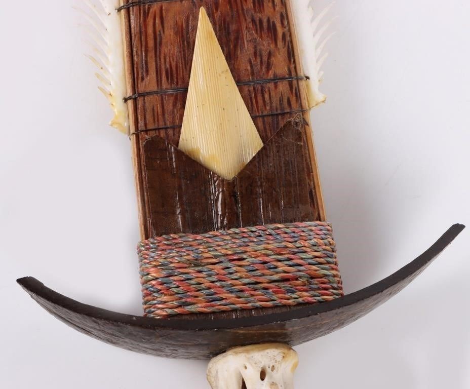 Rare Gilbert Islands shark's tooth Kiribati warrior's sword made in Micronesia. This blade is made out of various fibrous plant material with a handle/pommel made out of bone vertebrae, whilst the cutting edge is wrapped in sharp shark teeth, and gill plates.