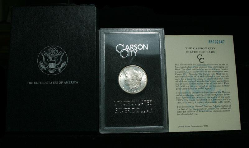 A rare Date GSA 1885-cc Morgan. This example comes in the original Box and with the COA. VERY RARE. After the US Government audited its vaults in the mid 70's they found a Hoard of Morgan Dollars in the basement vault in the federal reserve. Between 1973 and 1980 the Government Services Administration (GSA) Packaged these rare Morgan dollars and auctioned them off to the public. Coin World lists a GSA ms64 at $900. Estimated Value $750