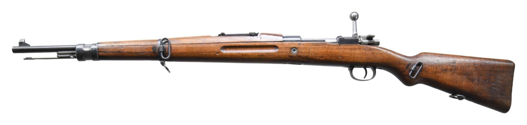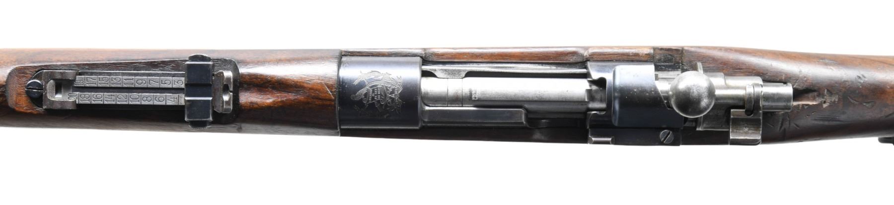 ACTION RIFLE. Cal. 7mm Mauser. S# 1292. Bbl. 23 1/4". Standard VZ-24 sights. Matching numbers on receiver, bolt & stock. Handguard has a loose fit & appears to be mismatched with a faint "07" number at left rear. Rare Guatemalan VZ-24 with only 4,000 rifles made prior to WW2. Receiver top has fully intact bold Guatemalan crest. Small locking screws are missing from bottom metal. Blued finish. Walnut stock set with both bottom mounted & left side sling swivels. Cleaning rod present. CONDITION: stock set shows scattered dings, handling marks & finish wear. Metal retains 60% original blue with some edge wear, scattered oxidation & fading to gray. Action functions properly when hand cycled. Bore shows scattered frosting & pitting but strong rifling. (25-5071/MJC). CURIO. $2750-3750.