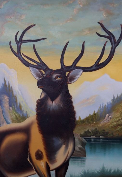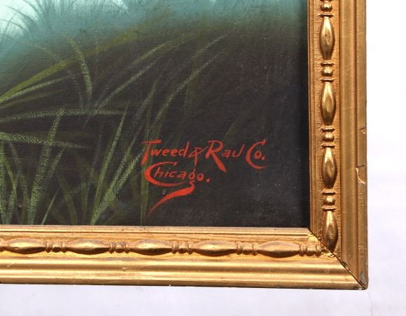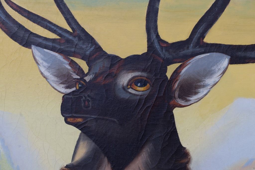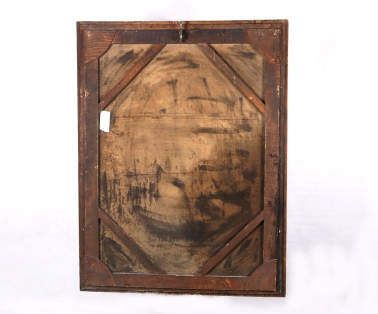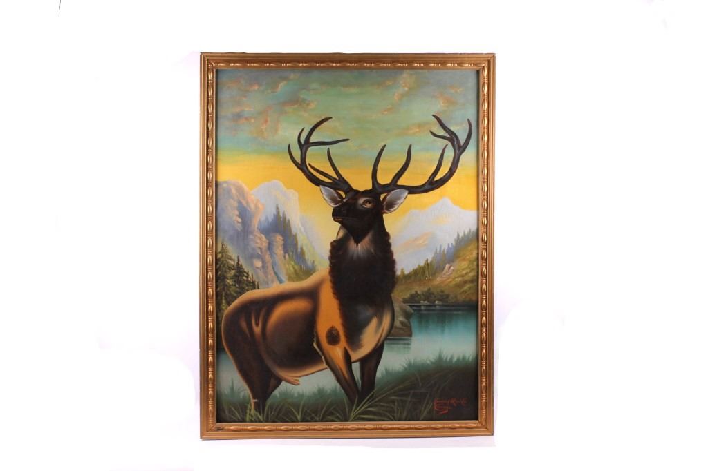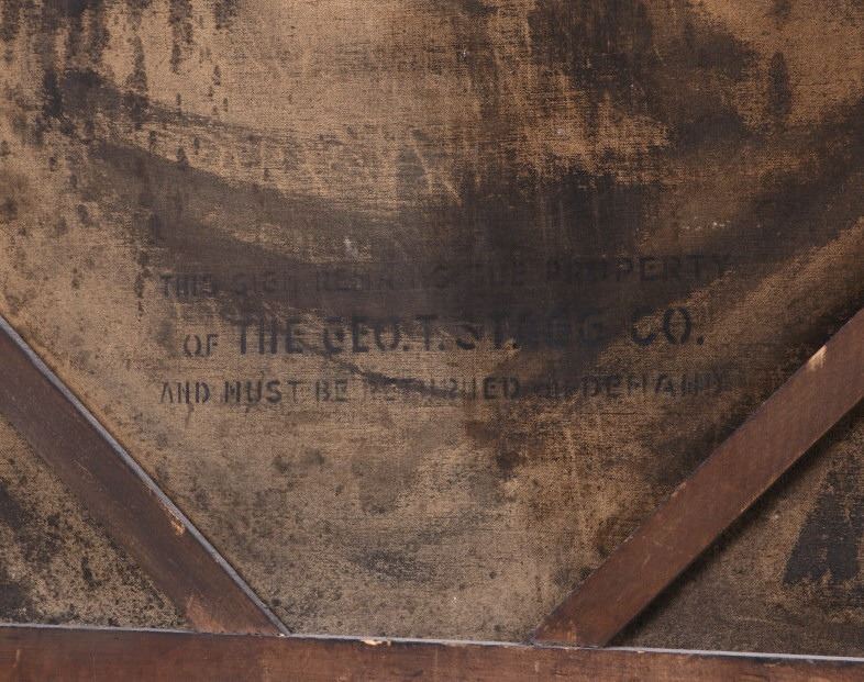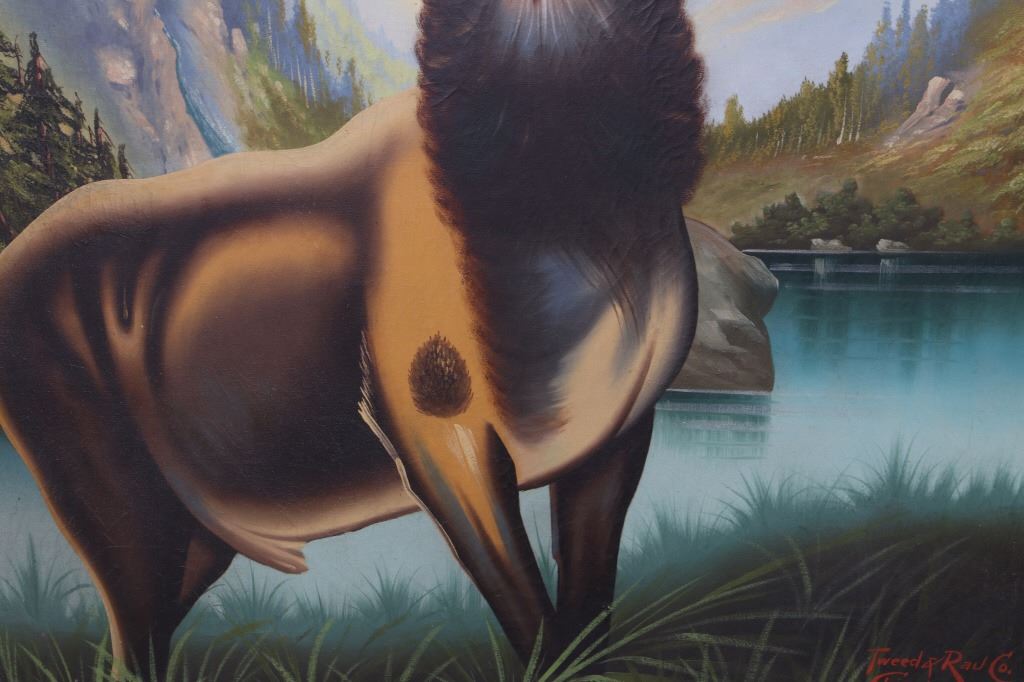 For your consideration is this original George T. Stagg Co. distillery advertising painting done by the Tweed & Rau Co. of Chicago. This advertisement shows a majestic stag set to a sunrise background with mountains in the distance and a swelling river scene just behind the large stag. George T. Stagg was born December 19, 1835, in Garrard County, Kentucky. When the Civil War ended, Stagg moved with his growing family to St. Louis, Missouri, where he worked as a whiskey salesman in St. Louis. As a salesman Stagg purchased barrels of O.F.C. and slowly grew his relationship with the bourbon icon E.H. Taylor, Jr. When Taylor hit financial hardships, Stagg used this as an opportunity to move from selling whiskey to making it and purchased the O.F.C. Distillery. Stagg & Taylor formed E.H. Taylor, Jr. & Co. with Stagg as the President. Together they built the most dominant American distillery of the 19th century, now known as Buffalo Trace Distillery. The painting is from the early 1900s, and was done by the Tweed & Rau Co. in an assembly style system where one artist would paint the background, another would paint the foreground etc., etc. The condition of this painting is fair as there is a small bit of damage to the lower left portion of the painting. The frame is in good condition overall. The consignor purchased this piece out of Spokane, Washington where it hung proudly for many years in a hotel bar advertising for the George Stagg Co. The measurements of this framed painting advertisement are 51 ½” x 39 ½” and the visible art measures 47 ½” x 37 ¼”.