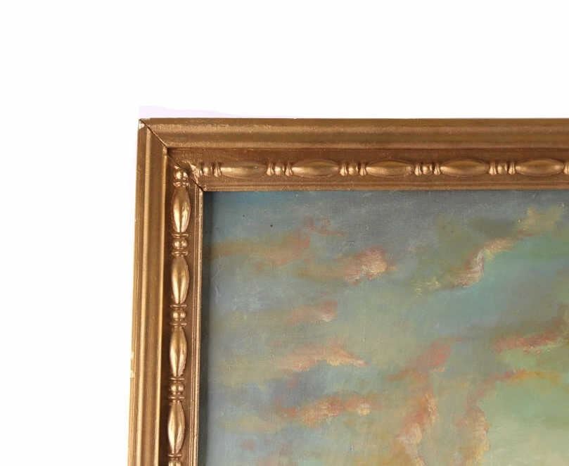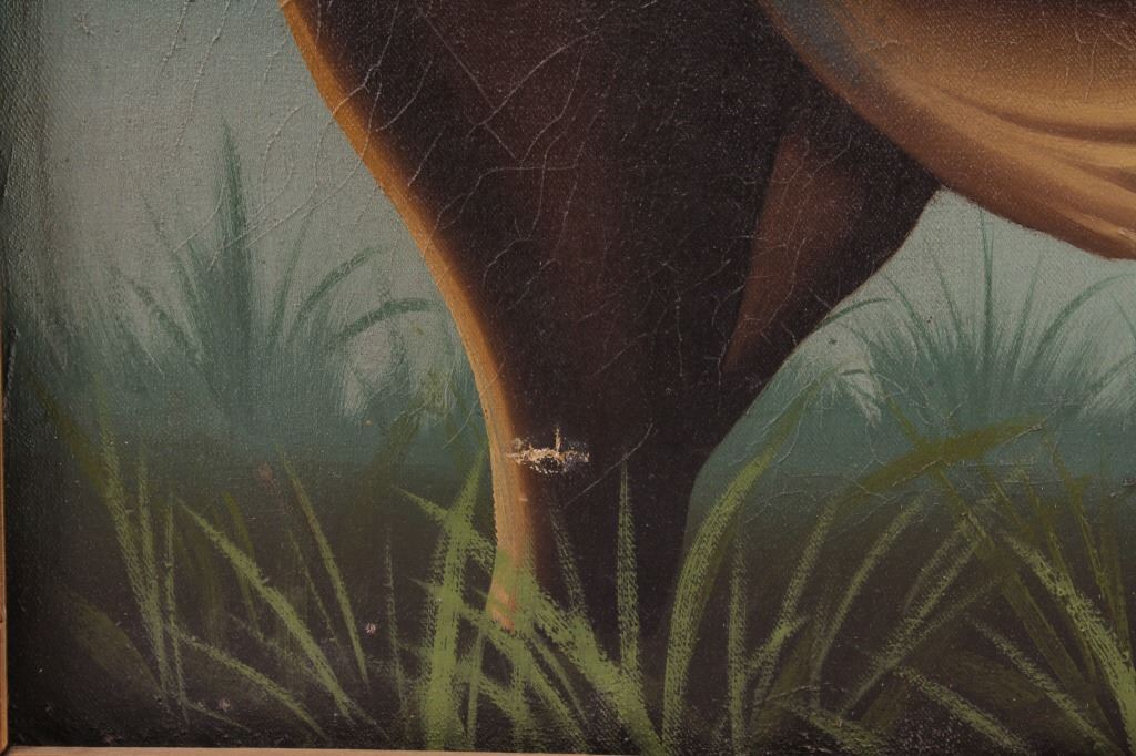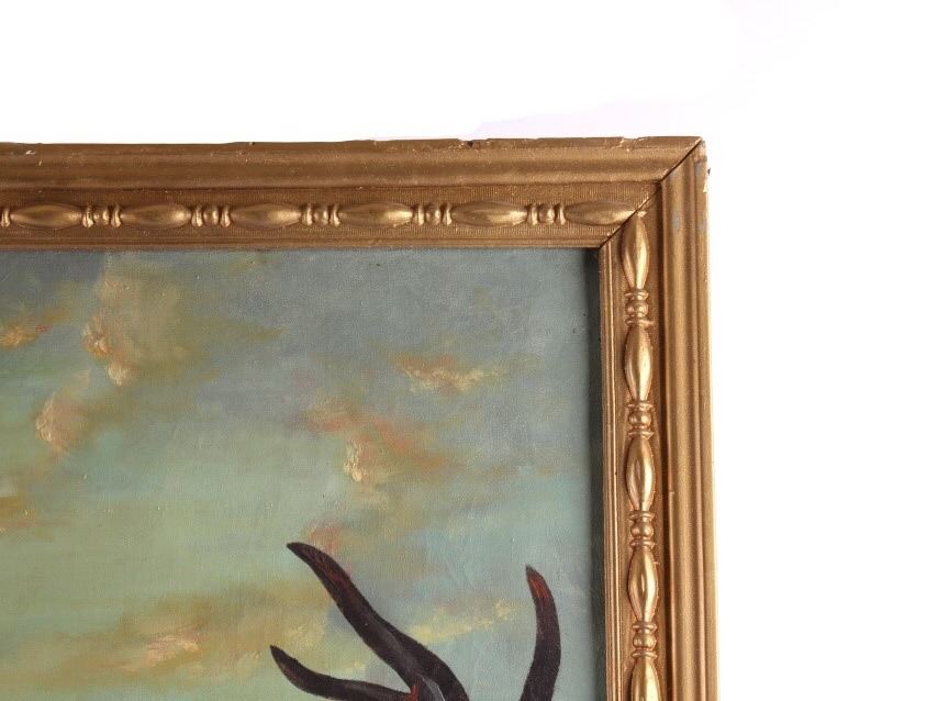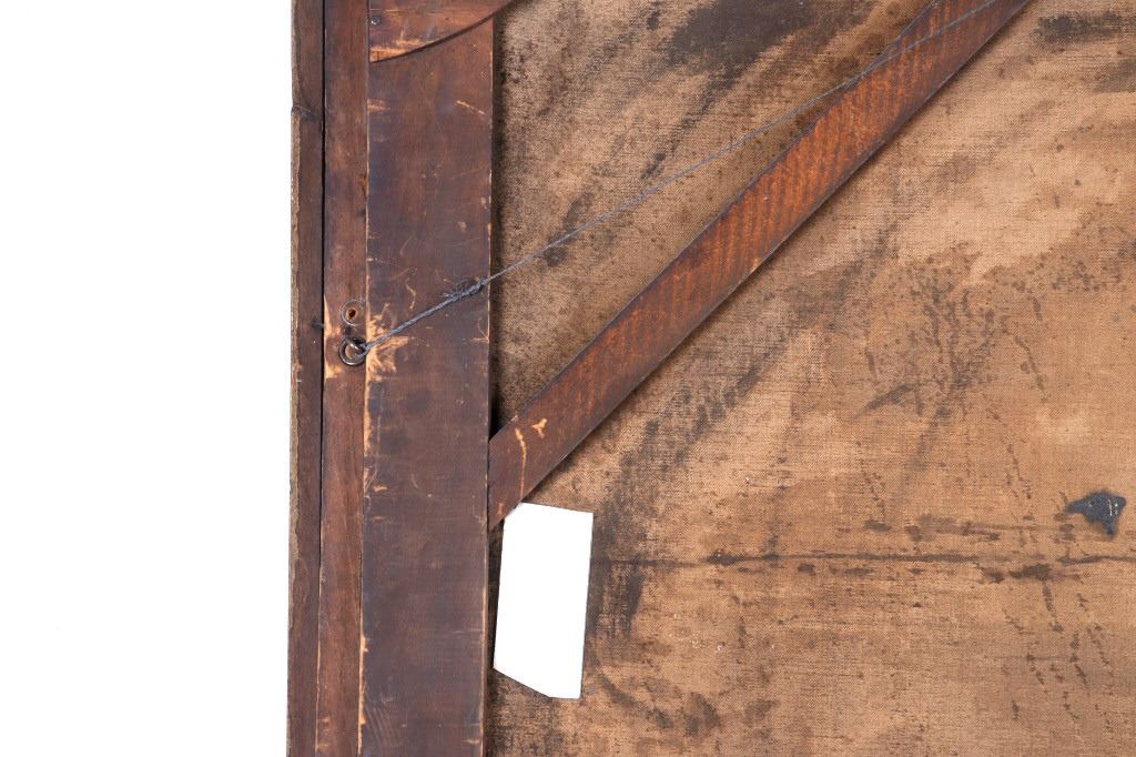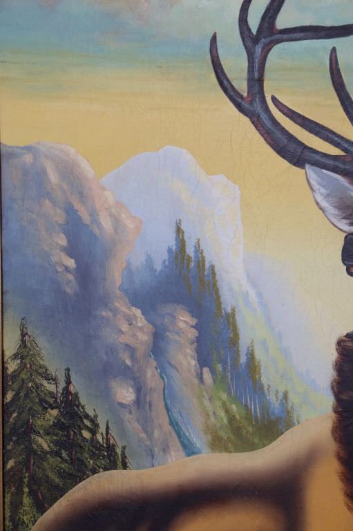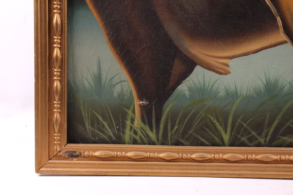 For your consideration is this original George T. Stagg Co. distillery advertising painting done by the Tweed & Rau Co. of Chicago. This advertisement shows a majestic stag set to a sunrise background with mountains in the distance and a swelling river scene just behind the large stag. George T. Stagg was born December 19, 1835, in Garrard County, Kentucky. When the Civil War ended, Stagg moved with his growing family to St. Louis, Missouri, where he worked as a whiskey salesman in St. Louis. As a salesman Stagg purchased barrels of O.F.C. and slowly grew his relationship with the bourbon icon E.H. Taylor, Jr. When Taylor hit financial hardships, Stagg used this as an opportunity to move from selling whiskey to making it and purchased the O.F.C. Distillery. Stagg & Taylor formed E.H. Taylor, Jr. & Co. with Stagg as the President. Together they built the most dominant American distillery of the 19th century, now known as Buffalo Trace Distillery. The painting is from the early 1900s, and was done by the Tweed & Rau Co. in an assembly style system where one artist would paint the background, another would paint the foreground etc., etc. The condition of this painting is fair as there is a small bit of damage to the lower left portion of the painting. The frame is in good condition overall. The consignor purchased this piece out of Spokane, Washington where it hung proudly for many years in a hotel bar advertising for the George Stagg Co. The measurements of this framed painting advertisement are 51 ½” x 39 ½” and the visible art measures 47 ½” x 37 ¼”.