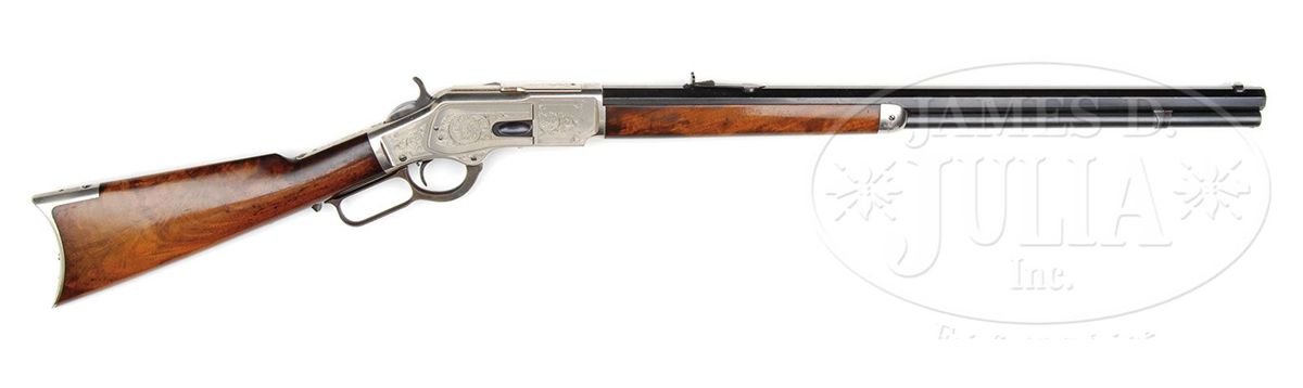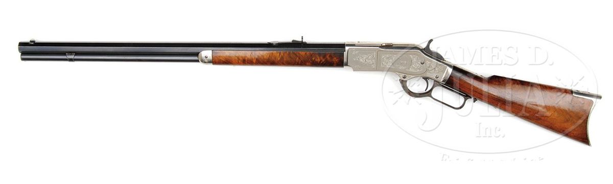 SN 127938. Cal. 44 WCF (44-40). Beautiful '73 with 24-1/4" oct bbl, full magazine, half nickel front sight and short semi-buckhorn rear sight with checkered edges. Mounted with very nicely figured, center crotch,flame grain American walnut, uncheckered, with straight stock & crescent buttplate with trap containing a 4-pc brass & iron cleaning rod. Receiver has a sgl set trigger. Left side of lower tang is stamped with assembly number "4835", "XXX" and an "R". Matching assembly number is found in top tang channel of buttstock which also has an "S". Matching number is also stamped inside toe of buttplate. Receiver, forend cap & buttplate are nickel finished. Receiver & sideplates are engraved by one of the Ulrichs, probably John. Engraving consists of the small rnd vignette of a standing whitetail buck in a field & forest scene with foliate arabesque patterns fore & aft with one scroll terminating in a large flower blossom. Front & rear flats of receiver are engraved to match. Right side has matching engraving with foliate arabesque patterns terminating in a large flower blossom on the sideplate. Top & bottom of receiver, dust cover, top tang, forend cap & buttplate tang are engraved to match. This exact rifle, identified by SN, is pictured, both sides, on p. 190 of the book Winchester Engraving, Wilson. Accompanied by a Cody Firearms Museum letter addressed to renowned Winchester researcher, author & authority, George Madis, which identifies this rifle with oct bbl, set trigger, fancy nickel trim & engraved; received in warehouse July 11, 1883 and shipped same day with four other arms to Order #4755. Such early 1873s are rarely found with nickel trim and engraved. PROVENANCE: Wes Adams Estate Collection. CONDITION: Extremely fine, all matching. Bbl & magazine tube retain 98-99% strong orig factory blue with only very light sharp edge wear and slight thinning in one spot on magazine tube and a few pin pricks of light surface discoloration over forearm area; receiver, dust cover & forend cap retain virtually all of their strong, bright, orig nickel with a few pin pricks of flaking on receiver and some minor flaking on bottom rear edge; buttplate retains about 96% orig nickel turned milky with wear on heel & toe; hammer retains about all of its orig factory case colors, turned a little dark; lever retains bright case colors on sides, faded on outer faces; wood is sound with a few very minor nicks & scratches with some oil staining around tangs and overall retains most of its orig factory varnish. Set trigger needs adjusting, otherwise mechanics are crisp, brilliant shiny bore, may be unfired; bolt face retains virtually all of its orig factory blue. 4-44568