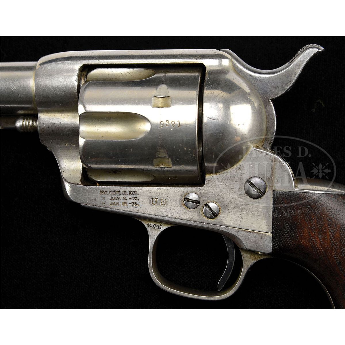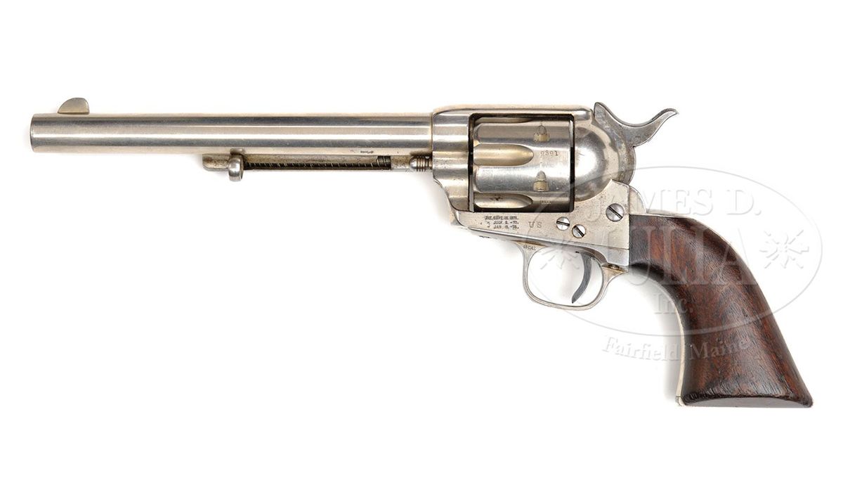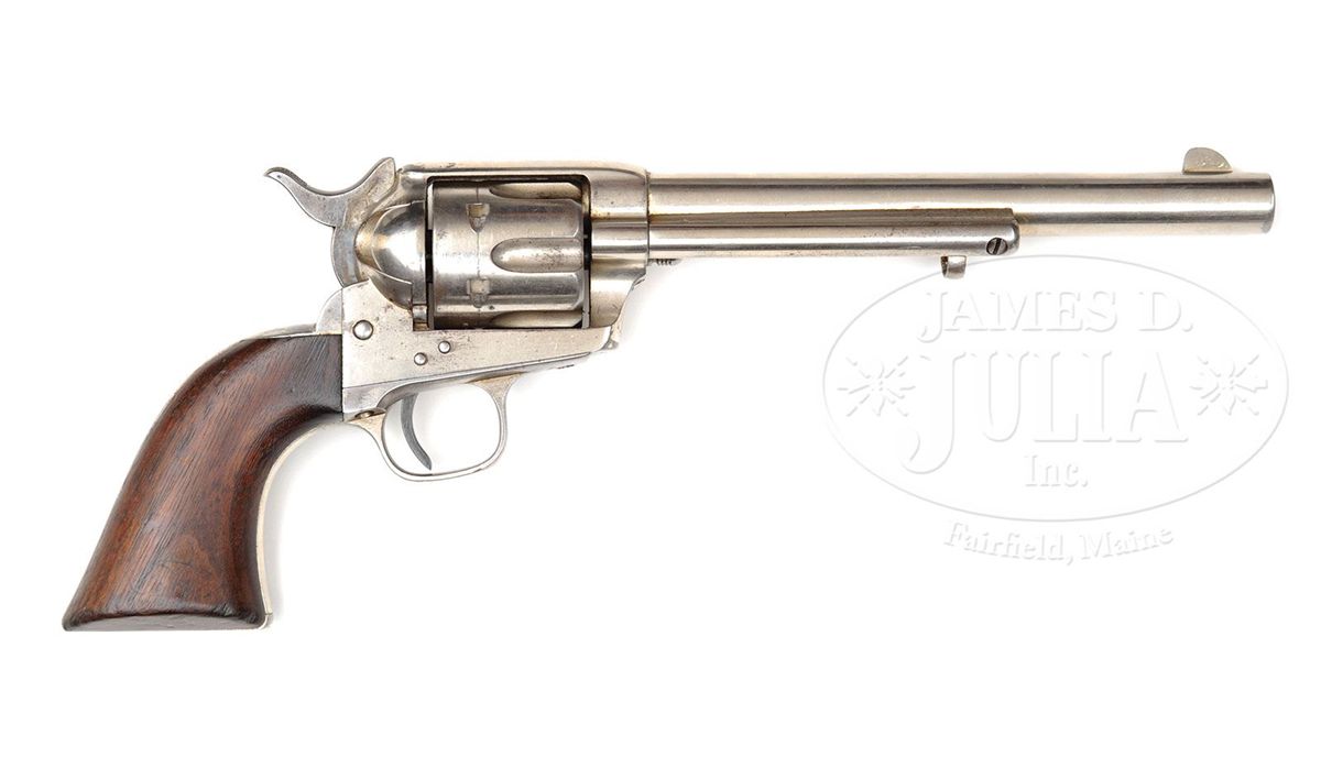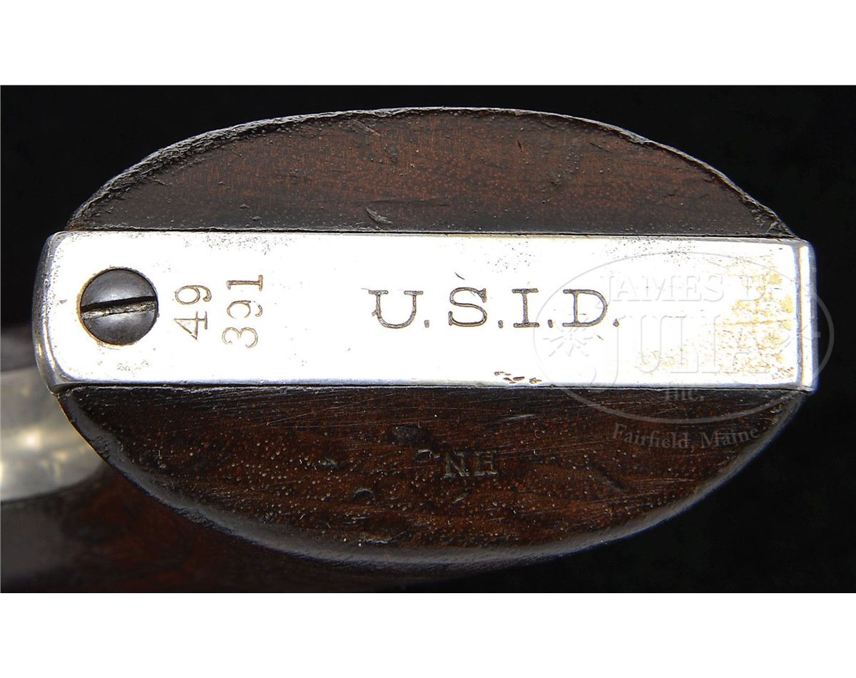 SN 49391. Cal. 45 Colt. Nickel finish with 7-1/2" bbl, full front sight and 1-line block letter address. Left side of frame has 3-line patent dates and "US". Left front web of trigger guard has the civilian caliber marking. Ejector housing is second type with bull's eye ejector rod head. Mounted with 1-pc walnut grip that has last four digits of matching SN in backstrap channel. Left side of grip has the outline of an oval cartouche as does the right side, neither of which are legible. Buttstrap is stamped in block letters "U.S.I.D.", which stands for U.S. Interior Department which was the governmental department in charge of Indian affairs, including the Indian Police. All visible SNs are matching and the bbl & cyl have the last four digits of matching SN. Frame, trigger guard, backstrap, bbl & cyl are all stamped "H.N." (Henry Nettleton), sub-inspector. Page 250 of A Study of The Colt Single Action Army Revolver, Graham, Kopec & Moore, disclosed that as of that writing there has only ever been one Single Action revolver reported with this buttstrap stamping. Over the years various theories & speculations have surfaced regarding Indian Scout/Indian Police issued nickel plated sidearms. Some of these theories are based on photographs of Indian Scouts and Police holding what appear to be nickel plated Single Actions. It is known that Gen. Custer, in order to distinguish individual units' arms, had them specifically marked and that he is believed to have issued his Scouts nickel plated Single Action revolvers. It is further known that individual Army officers could purchase nickel plated revolvers through the National Armory as there are several recorded letters & invoices for such revolvers. It should be noted that the screws & trigger are fire-blued and the hammer is color case hardened which is typical of those revolvers nickel plated by the Colt factory whereas those revolvers known to have been plated at the National Armory or by a private firm had nickeled screws & hammers. Accompanied by a Colt factory letter identifying this revolver in caliber 45, bbl length, finish & type of stocks not listed, sold to & delivered to U.S. Government on Aug. 12, 1878 in a shipment of 150 guns. CONDITION: Very fine plus. Overall retains most of a strong, bright nickel with some extremely fine freckling on the frame; cyl retains most of its nickel with some very fine flaking in two or three of the flutes; trigger guard & backstrap retain dull nickel mixed with polished metal; hammer retains strong case colors on right side with traces elsewhere, faded to silver on top. Grip is sound showing heavy edge wear and a dark & worn patina. Mechanics are fine, bright shiny bore. 4-48759 JR337