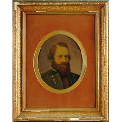 RARE HISTORIC JEB STUART - HAND COLORED IMPERIAL TINTYPE. 12" x 10" tintype mounted by "Lows Photographic Studio, 79 Princess Street/Wood and Co Successors". According to an accompanying letter by a dealer, the tintype came from an estate that also contained the uniform of Jeb Stuart's courier, Edward Landstreet. Also with tintype are two Confederate bank notes, one from the State of Georgia and one from the State of Alabama. CONDITION: Photograph is in excellent condition, nicely hand colored showing a bearded Stuart in his frock coat. Back of frame is covered with a clear piece of Plexiglas showing photographic studio tags, one with instructions to the painter telling what colors to use for hair, beard and eyes. This is a one-of-a-kind item, and would enhance any collection of Confederate historical items. 4-53489