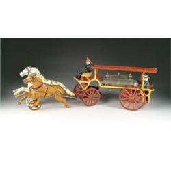 RARE HORSE DRAWN CHEMICAL WAGON BY WILKINS. A spectacular horse-drawn toy drawn by a caramel and white horse, the back end contains the nickel-plated chemical tank, a cast iron bucket hanging from frame & two iron ladders (replacements). The enameling of this toy is sensational with pinstriping to the whiffle tree & wheels; the back end is painted in red with yellow & black highlighting. A seated driver with a standing fireman at rear. Unique bell assembly under driver's seat. SIZE: 19 1/2". CONDITION: Overall is very good to fine. JL 1-4000 (4,500-5,500)