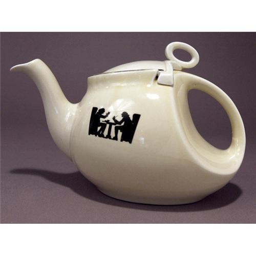 Very Rare!! Hall China, this is a beautiful Silhouette 1930 Streamline Teapot with Platinum Trim by Hall China. The streamline teapot was originally introduced in 1930. Silhouette line of Hall pottery has two seated figures with a table and 2 high back, bench like chairs, a black silhouette against a cream white ceramic with silver trim around the lid. As Silhouette pieces of Hall china are hard to find this is a jewel a beautiful piece! The capacity is 6 cups. The measurements are 6-1/2 inches tall and 9-1/2 inches from spout to handle. TMK is a gold backstamp of "Hall's Superior Quality Kitchenware ~ Made In U.S.A."This is a full size Hall teapot, in excellent condition.Please check wendi's attic on goantiques for more collectibles