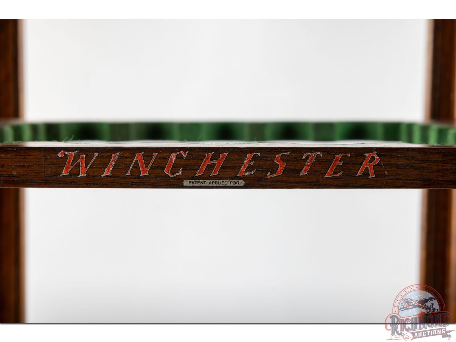 This stunning factory retail display cabinet was manufactured by the Walrus Manufacturing Co in the early 1900s to aid Winchester dealers in displaying their Winchester long guns. Walrus Manufacturing Co's brass plaque is present on the bottom of floor plate. It is constructed of tiger oak and walnut with full length crude glass panels that dates this previous to 1920. A detachable cathedral top with glass panels and wood finial sets firmly on top. Height is approximately 73" on its four legs with brass sheathed feet, and each side is approximately 18" wide. The inside display height is approximately 45". Interior four sided racks will accommodate up to 20 long guns. All four sides are 5/8 inch thick and are marked "WINCHESTER" in black outlined red letters with black lettered "PATENT APPLIED FOR" on a white background below. The bottom of the case and the inner edge of the rack is lined with green felt. An absolute must have for display of any fine Winchester collection!