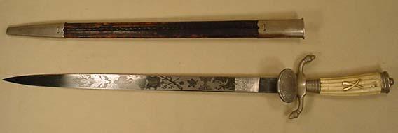 RARE IMPERIAL GERMAN SHOOTING ASSOCIATION DAGGER W/ SCABBARD - MARKED WMW WAFFEN - Beautiful designs on the blade. Some damage to the delicate celluloid handle.